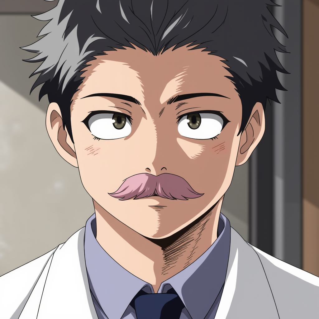 Японский врач средних лет, 45-50 лет, с серьёзным сосредоточенным лицом. Короткие тёмные волосы, на висках отчётливо видна седина — светлые пряди контрастируют с основным цветом волос. Самая заметная и необычная деталь его внешности — аккуратные, ухоженные усы мягкого розового цвета. Усы не просто слегка розоватые, а именно розовые — они сразу бросаются в глаза и придают индивидуальность его строгому облику. Он одет в безупречный белый халат. В уголках глаз — глубокие морщины усталости, взгляд внимательный и профессиональный. Фон — стерильная больничная палата. Мягкий клинический свет. Фотореализм, кинематографичное освещение, детальный портрет, резкий фокус на лице.