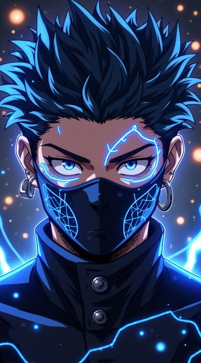 My Hero Academia style portrait of a teenage boy. He wears a form-fitting, armored half-face mask covering his nose, mouth, and jaw. **Glowing neon blue circuit tracings and jagged, graffiti-style line art** pulse across the matte black surface of the mask. His intense eyes and facial piercings (left ear only, right eyebrow) stand out against the glow. Dark, vibrant cyberpunk aesthetic, cinematic lighting. Avoid: gas mask, canister, hose.