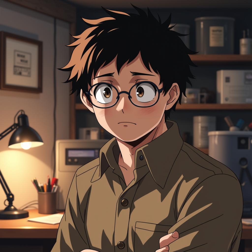Японский мужчина 35-40 лет, инженер. Простое, усталое, но доброе лицо. Короткая стрижка, круглые очки. Одет в простую рабочую рубашку. Выражение лица задумчивое, с легкой тревогой в глазах. Фон — теплый, немного захламленный домашний гараж или мастерская, вечернее освещение от настольной лампы. Стиль: реалистичная цифровая живопись, мягкий свет, атмосфера уюта и скрытого напряжения.
