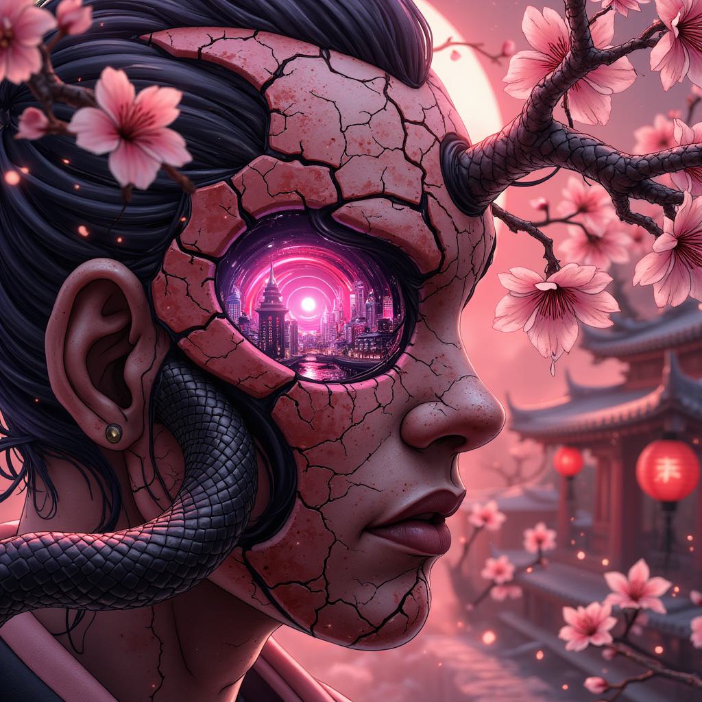 dark fantasy book cover, a cracked Japanese ceramic mask (Noh mask), terracotta clay texture, inside the cracks reveals a neon-lit cyberpunk cityscape, a black snake coiled around a glowing cherry blossom branch pierces through the mask, cinematic, hyper-detailed, atmospheric, trending on ArtStation, deep black and terracotta orange color scheme, --ar 2:3 --style raw