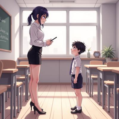 Молодая высокая учительница лет 20, с черными волосами с косичкой и фиолетовыми глазами, одетая в белую рубашку, в короткую черную юбку карандаш и высокие каблуки без колготок, разговаривает в пустом классе с учеником младших классов лет 10 мальчик маленького роста с короткими черными волосами и голубыми глазами который одет в школьную форму