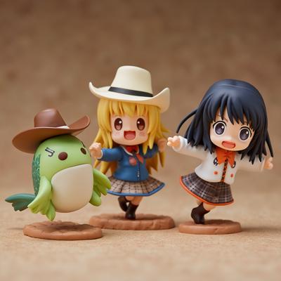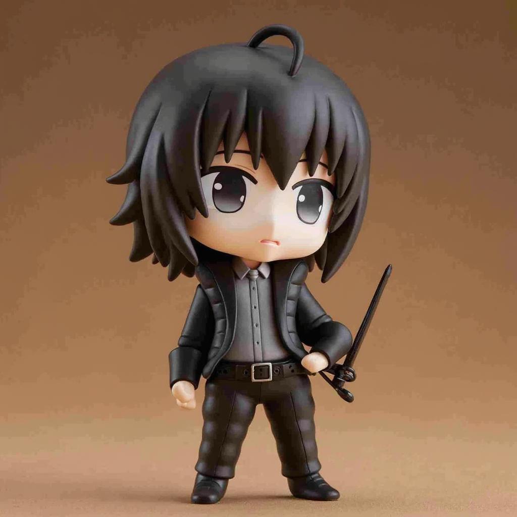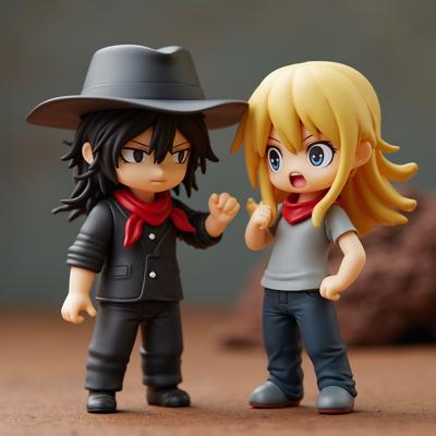 нарисуй как человек с головой рыбы вместе своей обычноц головы одетый в чернуб ковбойскую шляпу и красную бандану на шее стоит рядом с девушкой с черными длинными прямыми волосами одетая в серую футболку и они оба зло смеются и указывают пальцем на толпу девушек которые выглядят одинакова: русые короткие волосы кончики которых чуть уложены наверх и одетых в черные свитеры