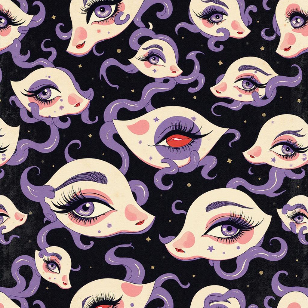 Hypnotic seamless pattern, dark cabaret surrealism. Many feminine eyes with long eyelashes and heavy eyeshadow in shimmering purple and gold. They are looking in different directions. Between the eyes are glossy red lip prints. The pattern swirls gently like smoke. Background is textured black paper. Mysterious, captivating, art nouveau style, intricate details.