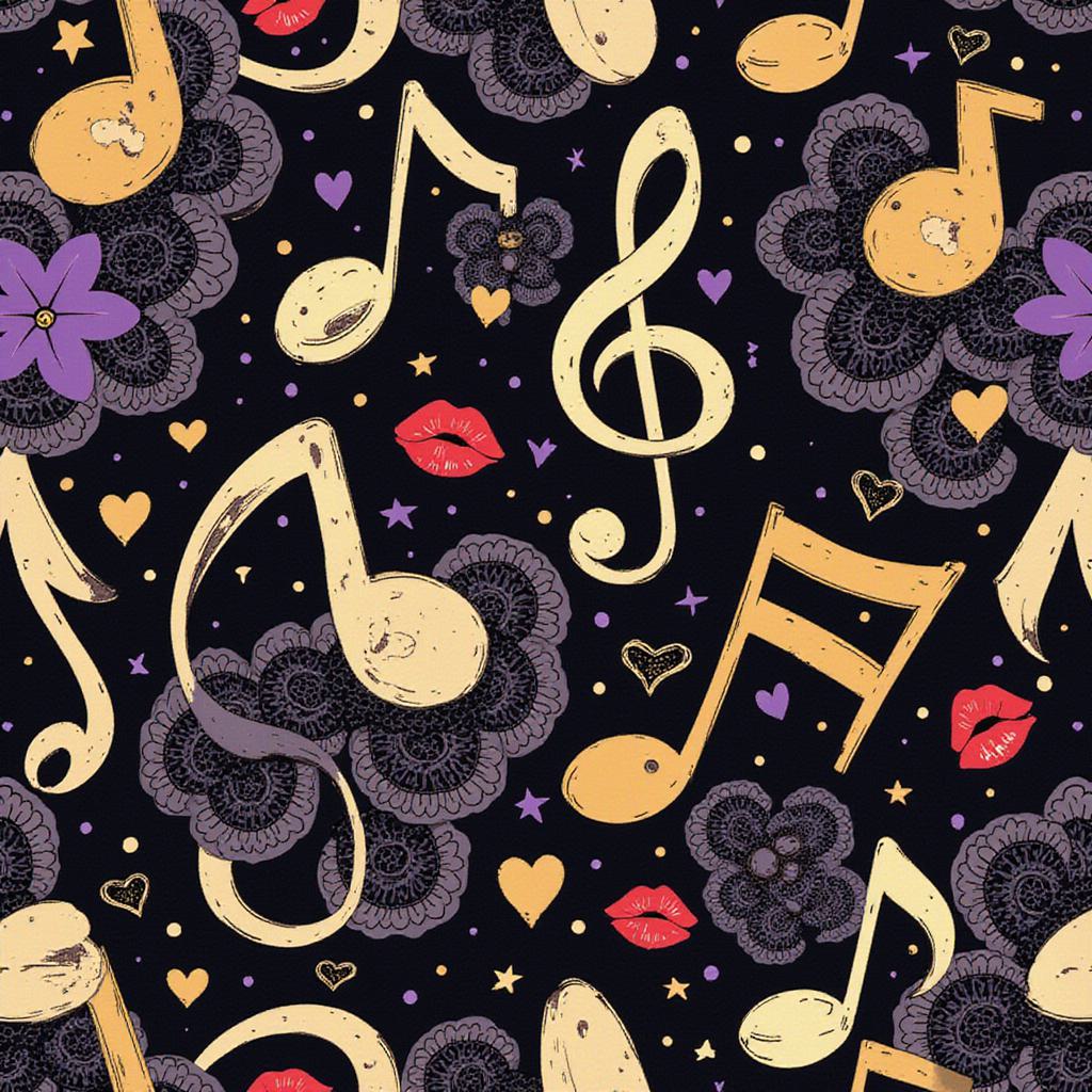 Seamless pattern, dark glamour cabaret aesthetic. Background is glossy black. Pattern made of metallic gold musical notes (eighth notes, treble clefs) twisted into playful shapes. Interwoven with intricate black lace patterns and bright red lipstick kisses. Touches of deep purple velvet texture peeking through. Mysterious, luxurious, gothic romance vibe, detailed vector pattern, perfect for fabric print.