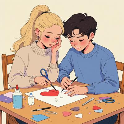 Милая пара сидит за деревянным столом и делает поделки своими руками. Девушка в уютном свитере вырезает красное сердце из бумаги ножницами, а парень рядом с ней рисует на бумажном сердце фломастером. На столе лежат цветная бумага, клей, ножницы и маленькие сердечки. Атмосфера тёплая и романтичная, фон украшен гирляндой из сердечек.
