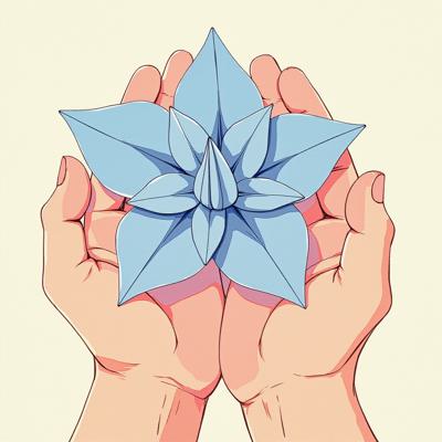 Illustration of two hands holding a delicate origami flower made of light blue paper. The flower has multiple folded petals, crisp edges. Hands are gently cupping it, drawn in soft line art. Background: plain off-white. Style: minimalist, folk-inspired, soft watercolor tones, no text, no additional elements.