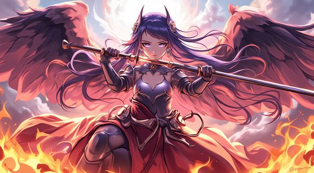 1girl, angel wings, armor, armored boots, asymmetrical wings, black wings, blue eyes, boots, breasts, cleavage, closed mouth, clothing cutout, day, embers, feathered wings, fire, gauntlets, greaves, helmet, holding, holding polearm, holding weapon, long hair, looking at viewer, medium breasts, navel, navel cutout, outdoors, pauldrons, pelvic curtain, polearm, shoulder armor, solo, spear, standing, thigh strap, thighhighs, visor \(armor\), weapon, white hair, white wings, wings