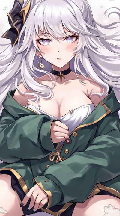 1girl, ak-12 \(girls' frontline\), black choker, black panties, black ribbon, blush, breasts, cardigan, choker, cleavage, collarbone, cross, cross earrings, green jacket, grey hair, hair ribbon, jewelry, large breasts, long hair, long sleeves, looking at viewer, lying, navel, necklace, panties, parted lips, purple eyes, ribbon, solo, stomach, thighs, underwear, unusually open eyes