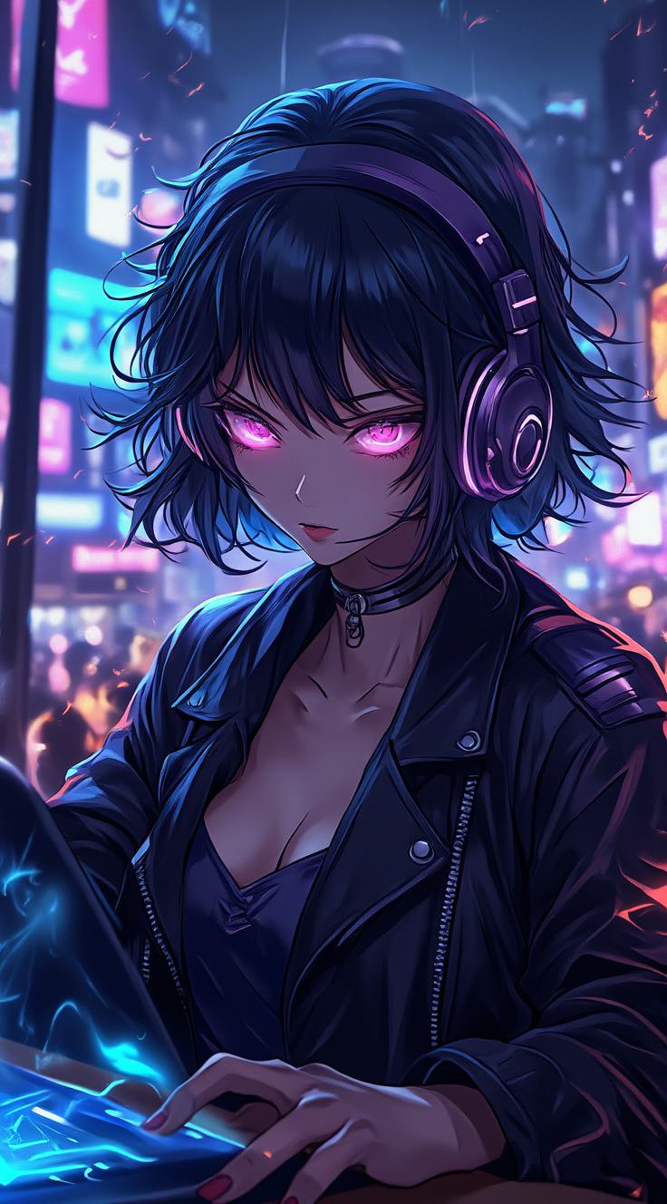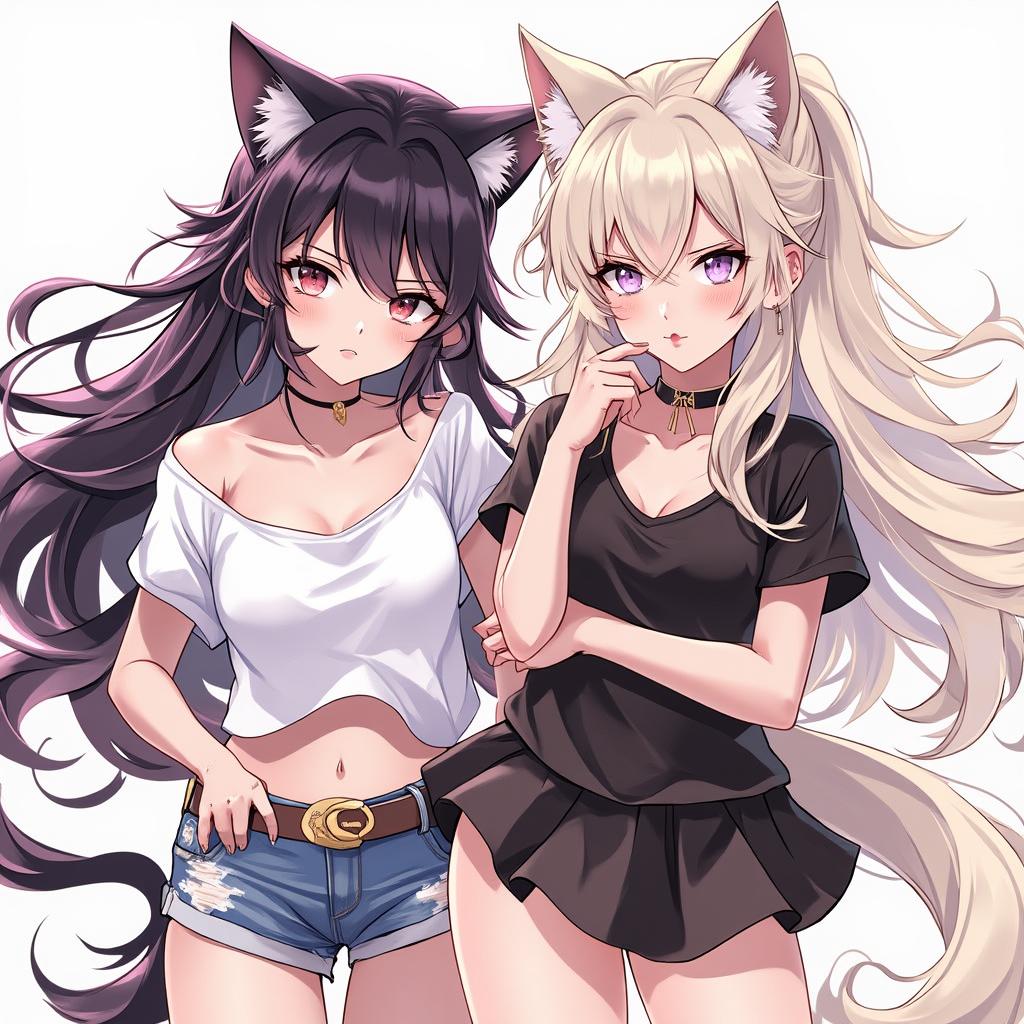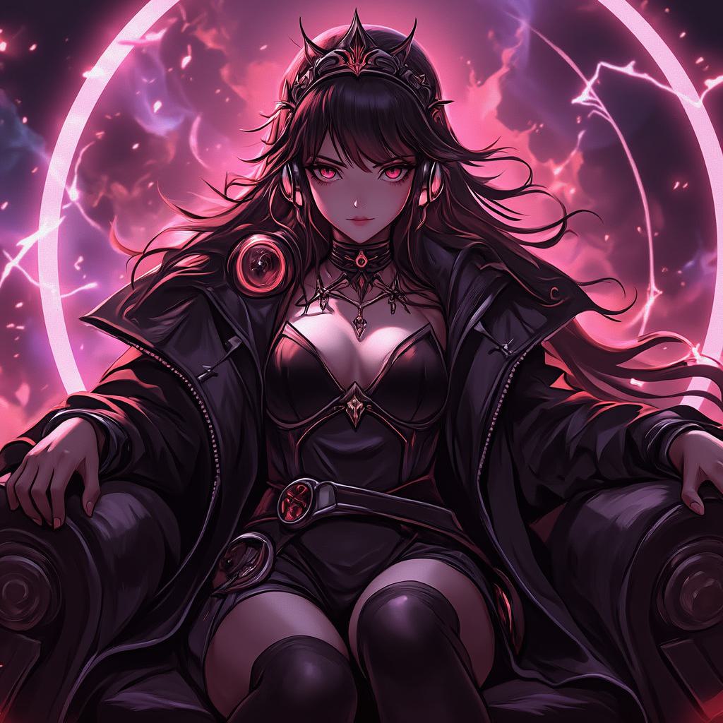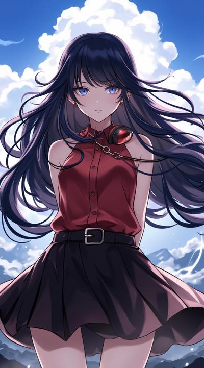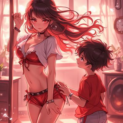 Высокая девушка лет 20, с длинными черными волосами и красными глазами, одетая в белую майку и красные кожаные шортики без обуви, танцует в светлой комнате стриптиз на шесте перед маленьким мальчиком лет 10, с короткими черными волосами и голубыми глазами который одет в красную футболку, белые штаны и черные носки, который смотрит на это сидя на кресле