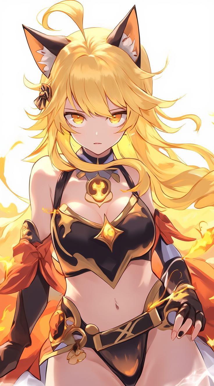 1girl, alternate costume, animal ears, bare shoulders, black bow, black bowtie, black nails, black panties, black ribbon, blonde hair, bow, bowtie, breasts, bridal gauntlets, cat ears, chuunibyou, cleavage, closed mouth, clothing cutout, crop top, elbow gloves, eyepatch, fischl \(genshin impact\), frilled shirt, frills, garter belt, garter straps, gloves, green eyes, hair bow, hair over one eye, hair ribbon, long hair, looking at viewer, maid headdress, medium breasts, midriff, nail polish, navel, panties, ribbon, shirt, simple background, sleeveless, sleeveless shirt, solo, two side up, underwear, white shirt, wing hair ornament