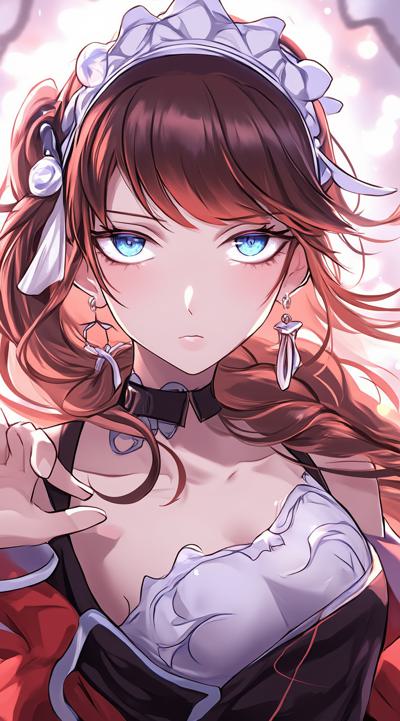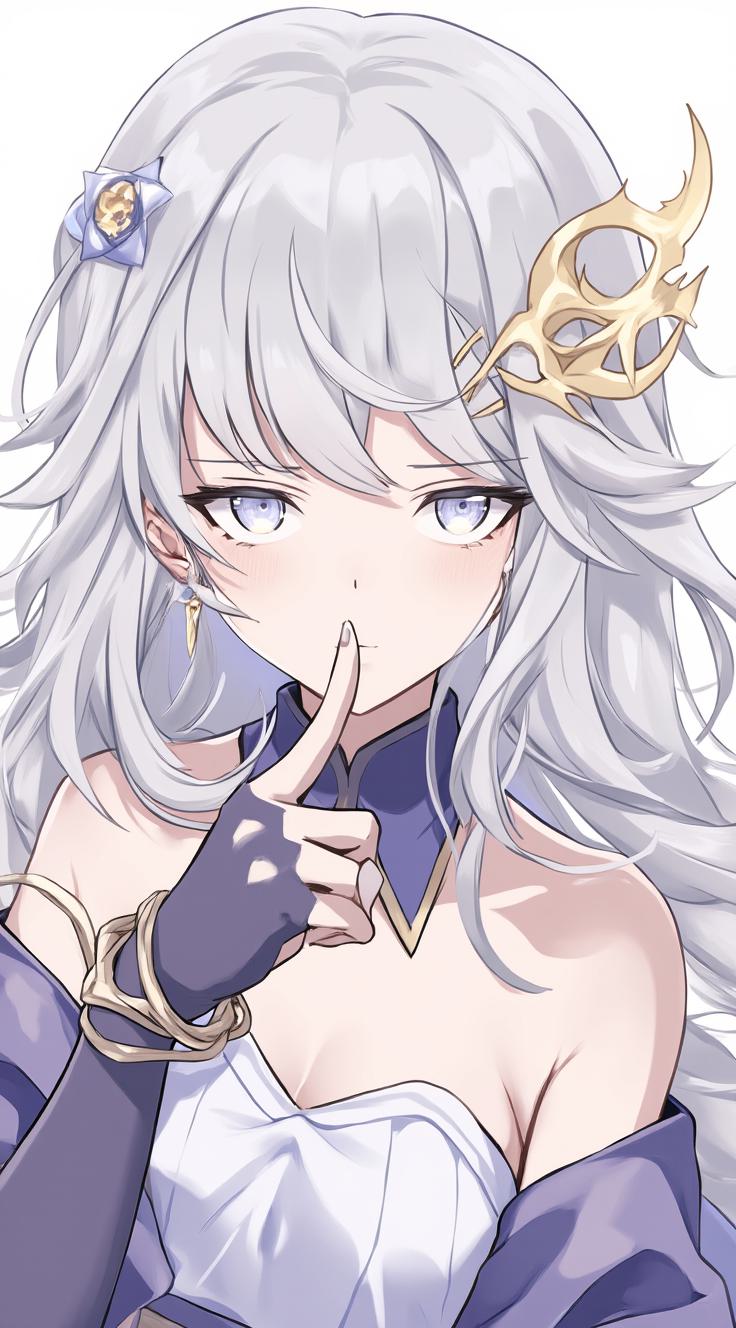 1girl, bare shoulders, braid, breasts, cleavage cutout, clothing cutout, crossed bangs, dress, finger to mouth, gloves, grey hair, hair between eyes, hair ornament, head tilt, index finger raised, long hair, looking at viewer, parted lips, side braid, small breasts, solo, upper body, white dress, white hair, yellow eyes