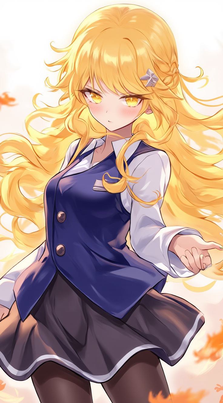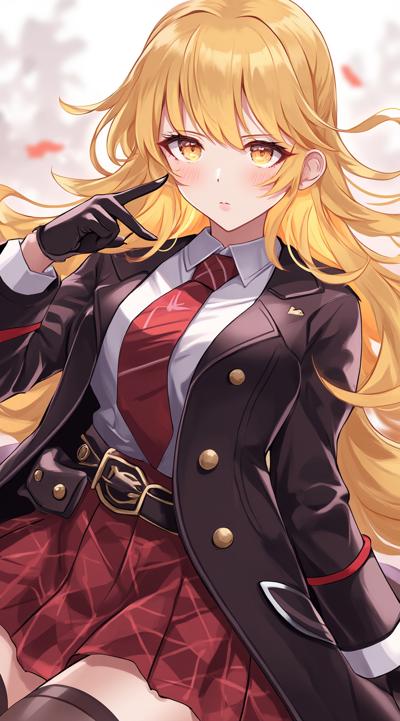 1girl, belt, black gloves, black jacket, black thighhighs, blonde hair, blurry background, blush, breasts, closed mouth, collared shirt, cowboy shot, gloves, hair between eyes, hand up, jacket, long hair, long sleeves, looking at viewer, medium breasts, miniskirt, necktie, plaid, plaid necktie, plaid skirt, pleated skirt, pouch, red necktie, school uniform, shirt, single thighhigh, skirt, smile, solo, standing, thighhighs, twintails, white shirt, yellow eyes