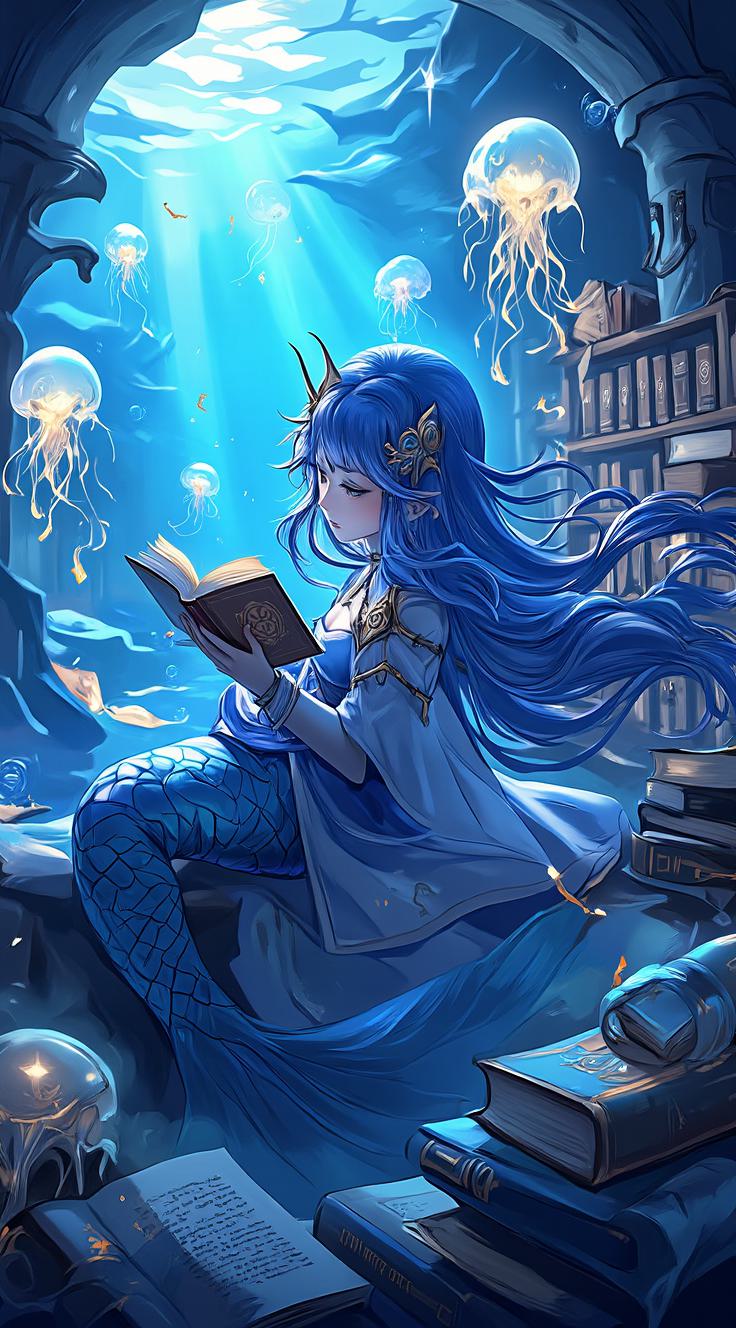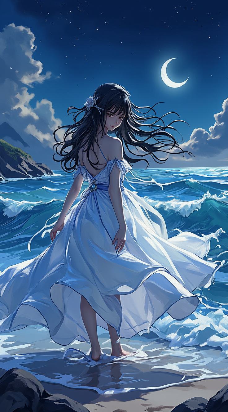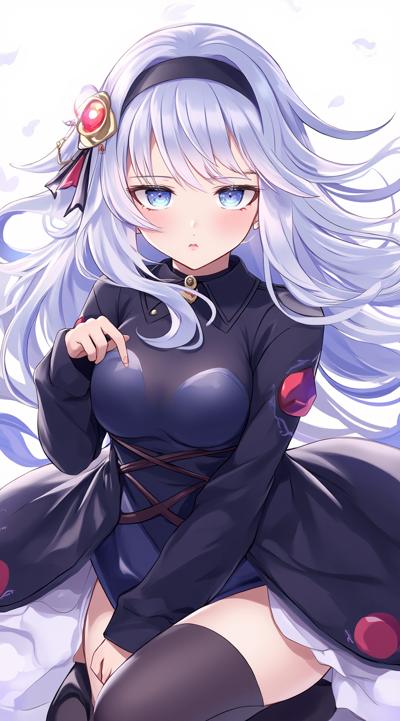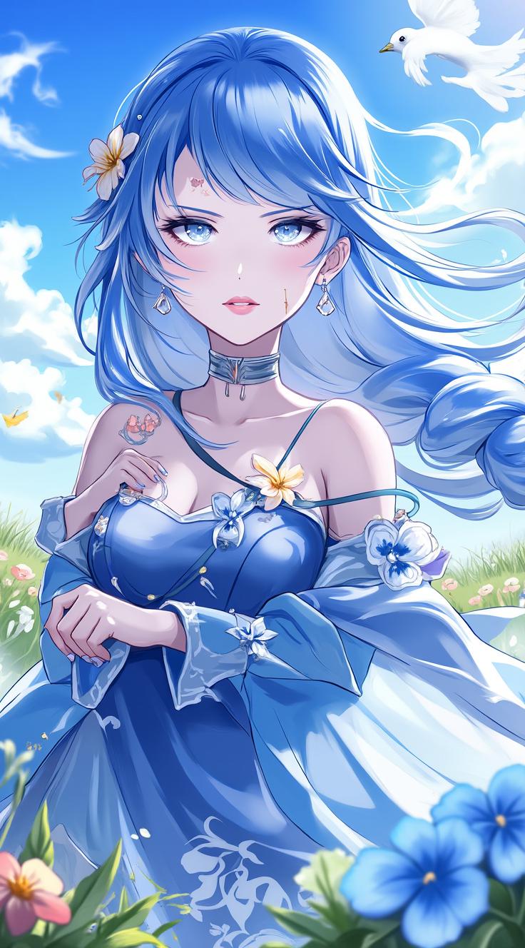 1girl, bare shoulders, bird, blue dress, blue eyes, blue nails, blue sky, breasts, cleavage, cloud, day, detached collar, detached sleeves, dress, earrings, field, flower, flower field, hair flower, hair ornament, jewelry, long hair, long sleeves, looking at viewer, nail polish, outdoors, parted lips, petals, pointy ears, sky, solo, white hair