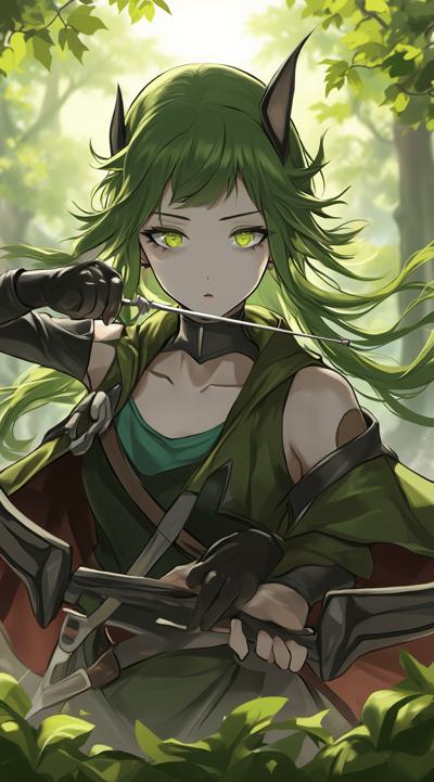 1girl, arrow \(projectile\), bare shoulders, belt, black bow, black gloves, black shorts, bow, bow \(weapon\), cape, closed mouth, cowboy shot, elf, forest, gloves, green eyes, green hair, hair bow, holding, holding bow \(weapon\), holding weapon, long hair, looking at viewer, nature, outdoors, outstretched arm, pointy ears, quiver, rain, short shorts, shorts, sidelocks, sleeveless, small breasts, solo, weapon