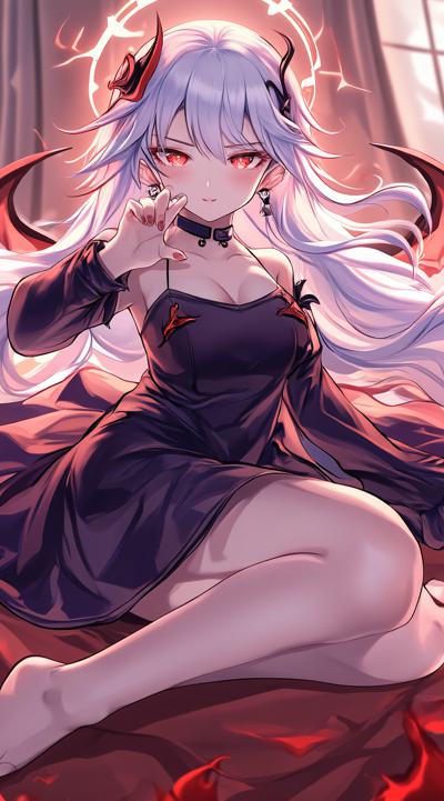 1girl, alternate costume, bare legs, barefoot, black dress, black footwear, black hair, blush, breasts, closed mouth, demon horns, demon wings, dress, ear piercing, earclip, feet, foot out of frame, foot up, grey hair, hair between eyes, halo, high heels, horns, indoors, kayoko \(blue archive\), leg up, legs, long hair, looking at viewer, multicolored hair, picture frame, piercing, red eyes, shoe dangle, shoes, side slit, single wing, sleeveless, small breasts, solo, standing, standing on one leg, toes, two-tone hair, white hair, wings