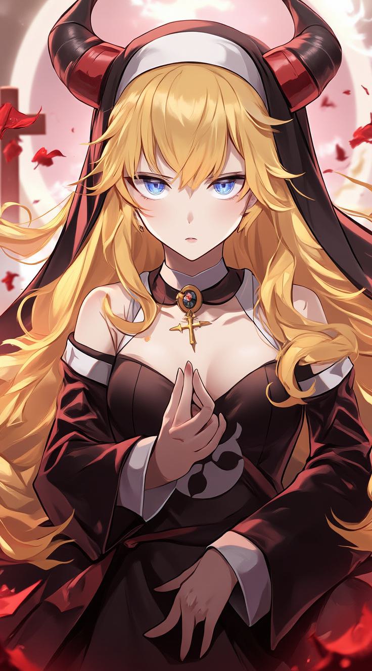 1girl, bare shoulders, black dress, blonde hair, blue eyes, breasts, clothing cutout, cross, cross necklace, dress, dutch angle, habit, horns, indoors, large breasts, long hair, looking at viewer, necklace, nun, own hands together, palms together, praying, solo, underboob, underboob cutout, upper body, veil, very long hair, wide sleeves, window