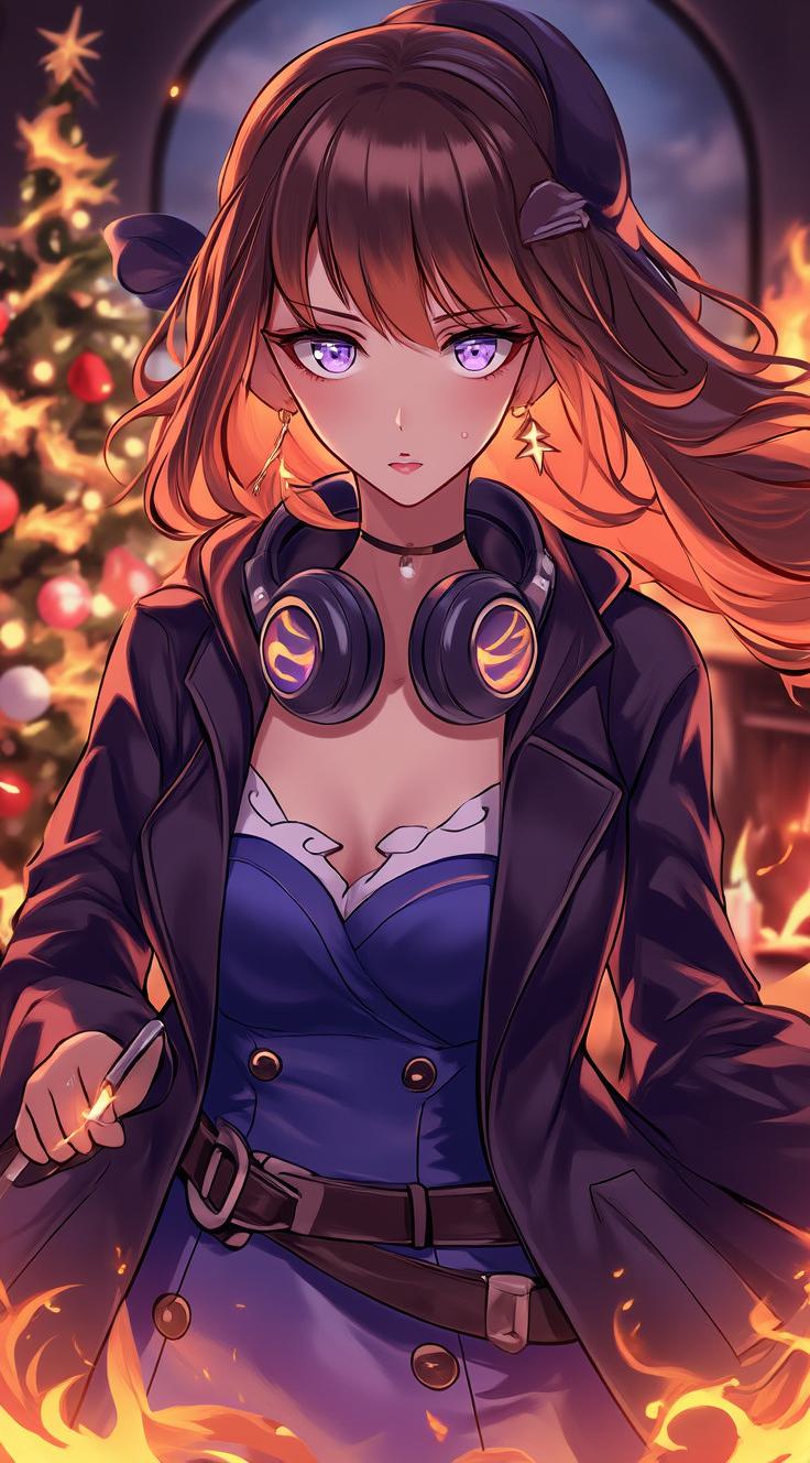 1girl, belt, blue dress, blue eyes, blush, breasts, brown hair, buckle, buttons, candle, chair, choker, christmas, christmas tree, cleavage, collar, dress, fire, fireplace, hat, headphones, headphones around neck, indoors, jacket, long hair, long sleeves, looking at viewer, medium breasts, night, santa hat, sitting, solo
