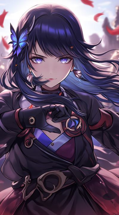 1girl, ahoge, black hair, black skirt, blue eyes, blurry background, breasts, butterfly hair ornament, closed mouth, collared shirt, colored inner hair, cowboy shot, crowd, earrings, face tattoo, falling petals, gloves, hair between eyes, hair ornament, jacket, jewelry, long hair, long sleeves, looking at viewer, multicolored hair, necklace, people, petals, purple hair, rain, red cardigan, red jacket, shawl, shirt, sidelocks, solo focus, standing, surrounded, tattoo, two-tone hair, white gloves, white shirt