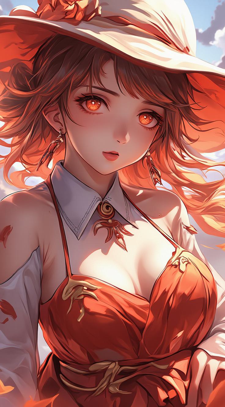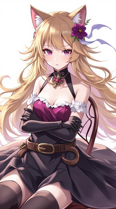 1girl, animal ear fluff, animal ears, bare shoulders, belt, belt buckle, black gloves, black skirt, breasts, buckle, cat ears, chair, covered eyes, cowboy shot, cropped torso, crossed arms, detached collar, detached sleeves, dress, ears through headwear, feather boa, flower, gloves, grey background, grey hair, hair over eyes, hat, hat ornament, long hair, multiple belts, open mouth, red dress, red gloves, red headwear, shawl, simple background, skirt, smile, solo, two-tone headwear, upper body, white belt, white hair, witch hat