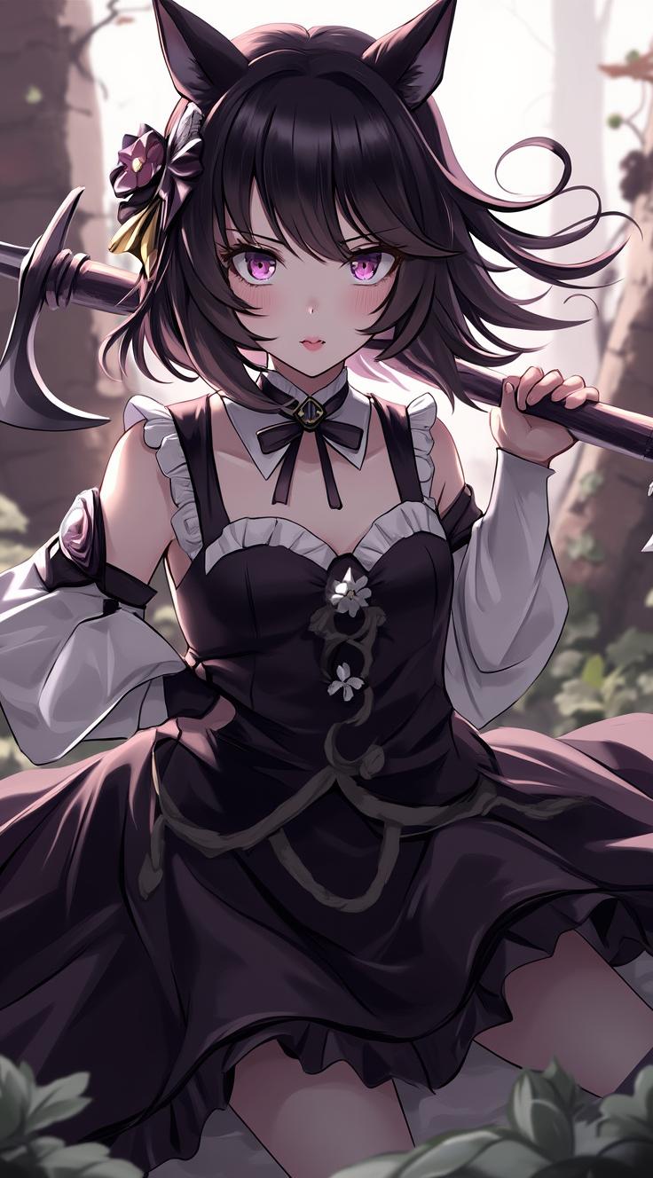 1 girl, animal ears, axe, black dress, black hair, black hips, straight bangs, blurred background, blush, bow, chest, brick wall, closed mouth, dress, frilly dress, side ruffles, gothic lolita, hair ribbon, short haircut, lolita fashion, long hair, looking at the viewer, medium chest, in nature, short sleeves with puffy sleeves, red bow, red eyes, red ribbon, red skirt, ribbon, short sleeves, solo, standing, hip strap, bare thighs, two-tone dress, very long hair, weapons