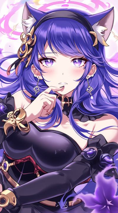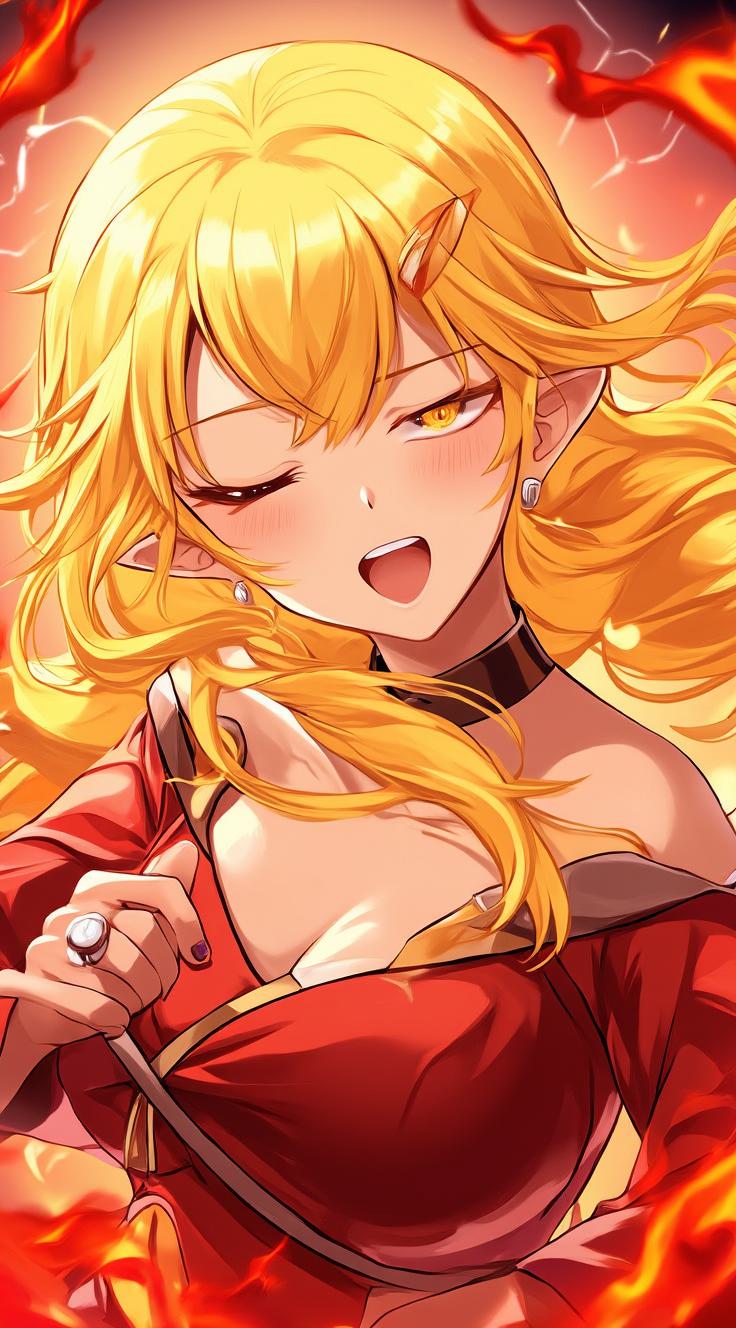 1girl, alternate costume, animal ear fluff, animal ears, armpits, black dress, black hairband, blue eyes, blush, breasts, cat ears, cross, cross earrings, dress, earrings, finger to mouth, frilled dress, frills, hair between eyes, hairband, halo, hat, jewelry, large breasts, long hair, looking at viewer, mini hat, mini top hat, orange hair, parted lips, sleeveless, solo, top hat, twintails, yellow halo