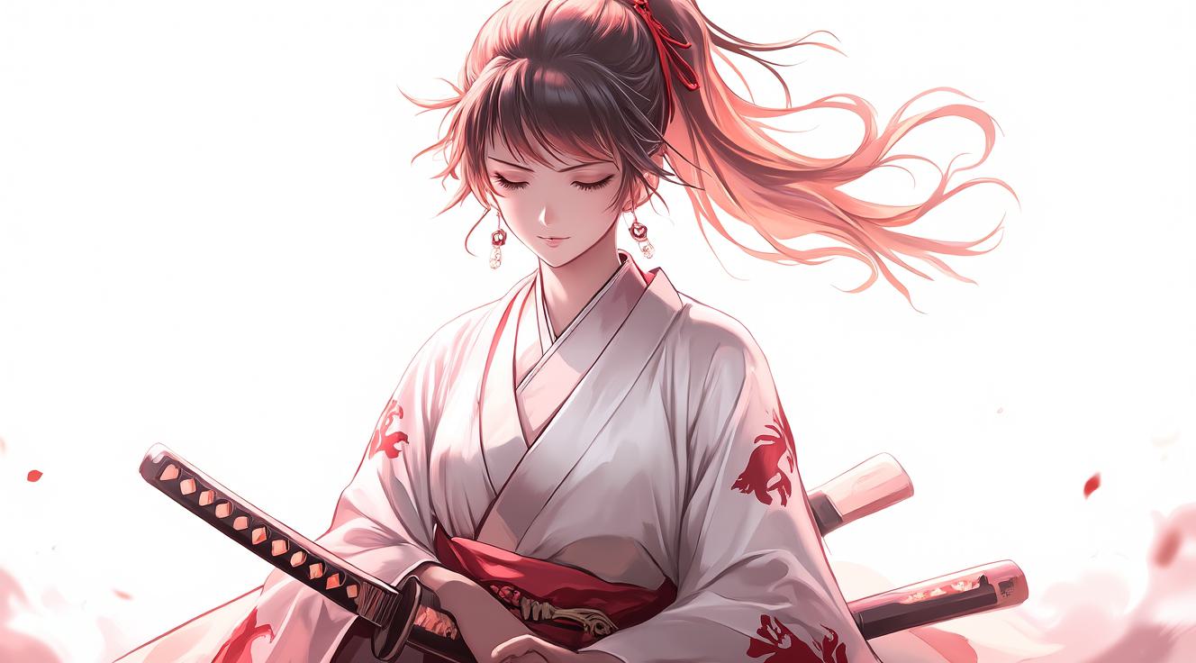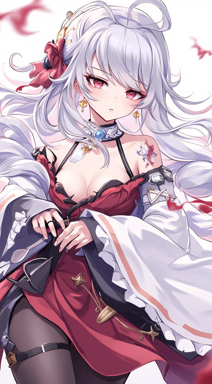1girl, bandage over one eye, bandaged arm, bandages, bare shoulders, belt, black pantyhose, braid, breasts, cleavage, closed mouth, collar, covered navel, cowboy shot, detached collar, detached sleeves, dress, earrings, eyepatch, floating hair, frilled sleeves, frills, grey hair, jewelry, long hair, low twin braids, medium breasts, one eye covered, pantyhose, red background, red dress, red eyes, red nails, red sleeves, red theme, solo, strapless, strapless dress, thigh strap, twin braids, very long hair, white hair