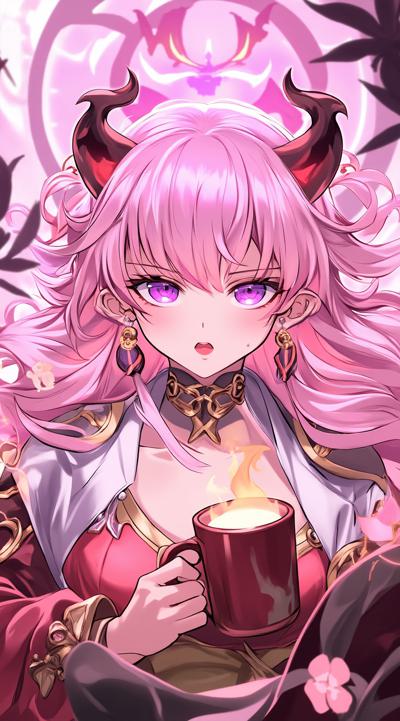 1girl, alternate costume, aru \(blue archive\), blush, breasts, brown horns, cup, demon horns, earrings, halo, holding, horns, indoors, jewelry, large breasts, long hair, long sleeves, looking at viewer, mirror, mug, open mouth, pink hair, pink halo, plant, potted plant, shirt, solo, turtleneck, upper body, window, yellow eyes