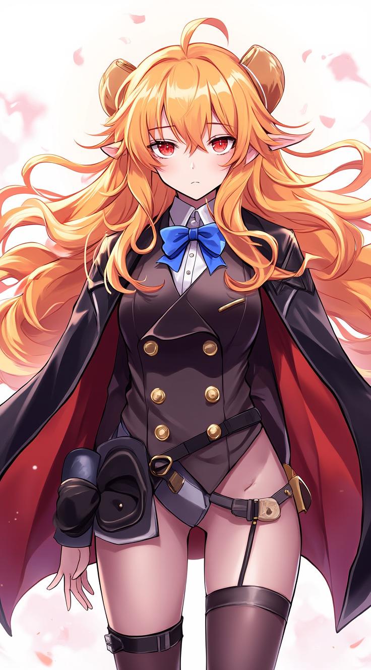 1girl, ahoge, belt, black bow, black footwear, blonde hair, blue bow, blue bowtie, boots, bow, bowtie, buttons, closed mouth, cone hair bun, double-breasted, hair between eyes, hair bun, hair intakes, jacket, long hair, long sleeves, looking at viewer, panties, pantyshot, pointy ears, red eyes, red jacket, red panties, red skirt, ribbon, school uniform, shirt, sitting, skirt, solo, stairs, thighhighs, thighs, underwear, uniform, white thighhighs