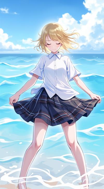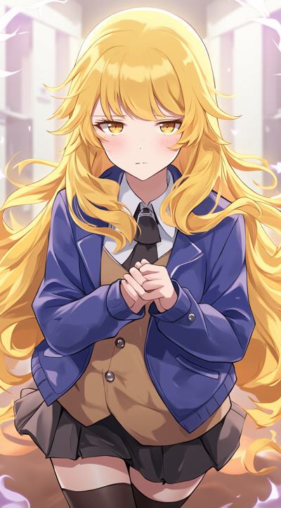 1girl, ahoge, black necktie, black skirt, black thighhighs, blonde hair, blue cardigan, blue jacket, blush, breasts, brown eyes, cardigan, collared shirt, indoors, jacket, long hair, long sleeves, looking at viewer, medium breasts, miniskirt, necktie, parted lips, pleated skirt, school uniform, shirt, skindentation, skirt, solo, standing, thighhighs, thighs, wavy hair, white shirt, window, zettai ryouiki