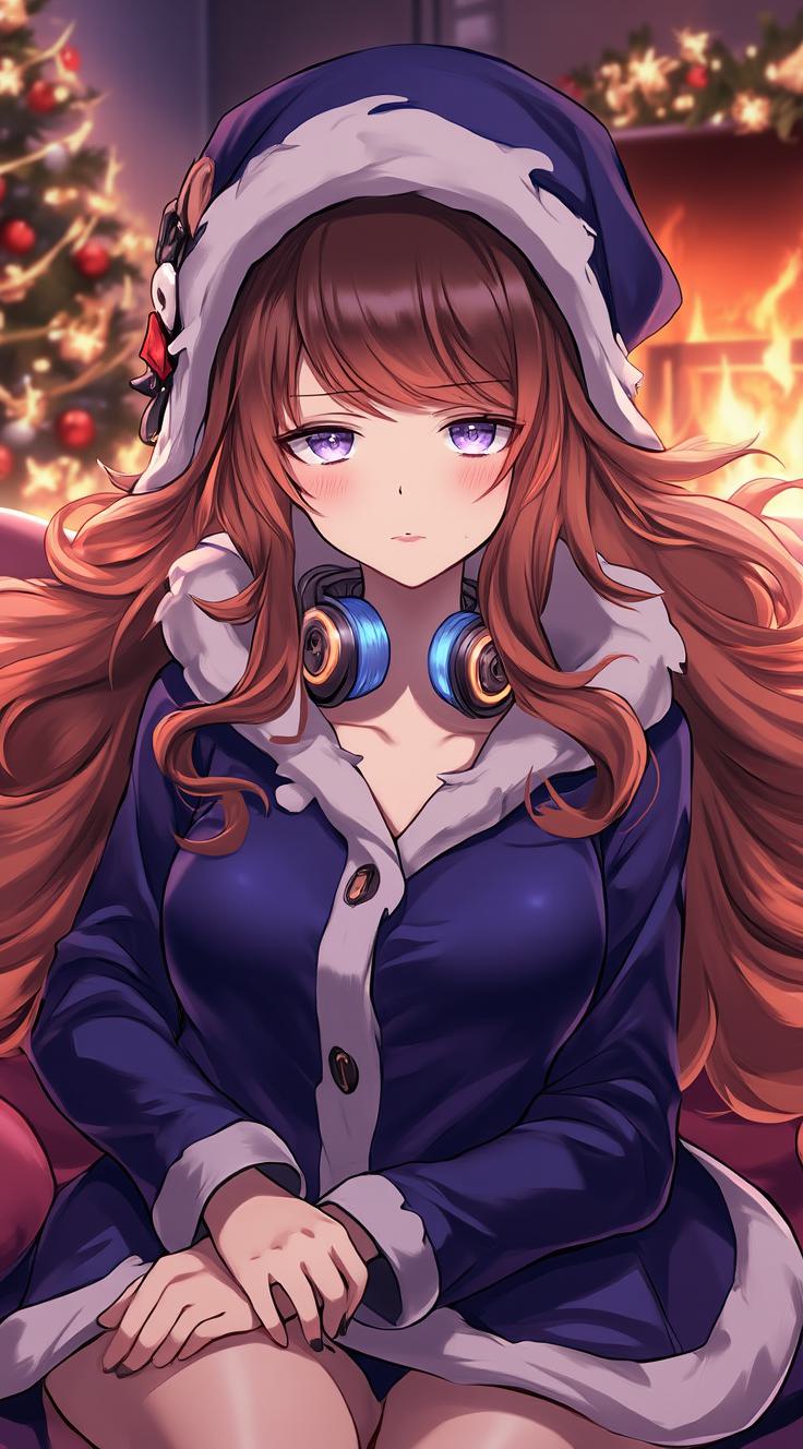 1girl, blue cardigan, blue eyes, blush, breasts, brown hair, candle, cardigan, christmas, christmas lights, christmas ornaments, christmas tree, closed mouth, couch, fireplace, fur-trimmed headwear, hair between eyes, hat, headphones, headphones around neck, indoors, large breasts, long hair, nakano miku, santa hat, shirt, smile, solo, upper body, white shirt, window, wreath