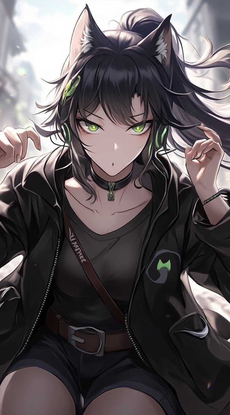 1 девушка, уши животного, черное пальто, черный воротник, черные волосы, черная куртка, черные шорты, размытый фон, кошачьи уши, девушка-кошка, кошачий хвост, закрытый рот, пальто, воротник, ключица, ковбойский снимок, наушник, зеленые глаза, украшение для волос, поднятая рука, гарнитура, удержание, инфекция наблюдатель куртка, наклонившись вперед, длинные волосы, длинные рукава, смотрит на зрителя, разноцветные волосы, ночь, официальный альтернативный костюм, открытая одежда, открытое пальто, открытый жакет, на улице, распущенные волосы, фиолетовые волосы, дождь, рубашка, шорты, соло, хвост, очень длинные волосы