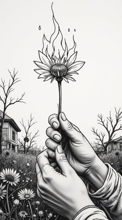 Символическая черно белая гравюра, разделённая на два плана. Драматический контраст близкого жеста и далёкого разрушения., Передний план:, Женская рука (тонкая, с изящными, но напряжёнными пальцами) держит цветок на стебле. Цветок горит. , Задний план: силуэты горящих домов. Не детальные, а размытые, как кошмар обрушенные крыши, остовы башен., Высококонтрастная гравюра. Только чистый чёрный, белый и агрессивная штриховка.