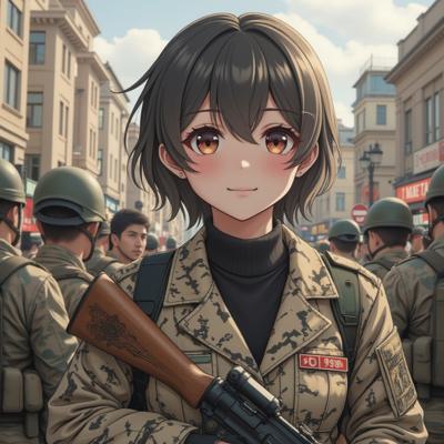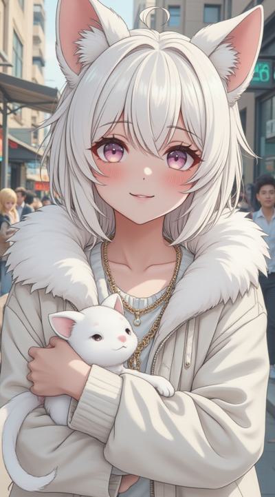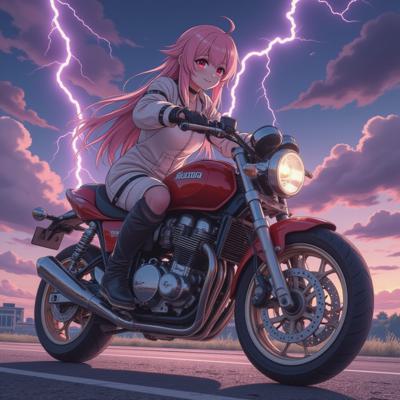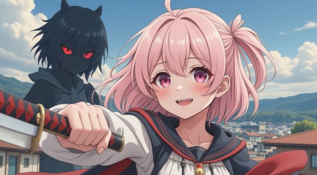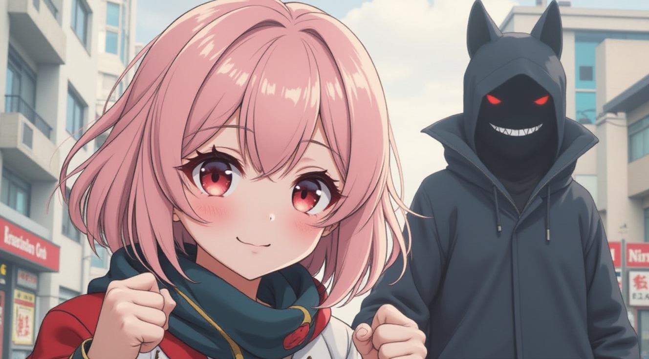 девушка в стиле аниме, волосы нежно розовые, лицо милой японки в боевой стойке (плащ/волосы развеваются, кулаки сжаты). Фон: размытый городской пейзаж или фантастический ландшафт. вдали видно тень противника (силуэт с острыми краями, зловещие глаза) рука персонажа сжимает рукоять меча/амулет/техно‑перчатку; крупный план пальцев — по ним пробегают искры/энергетические линии; взгляд персонажа — решительный, с отблеском силы.
