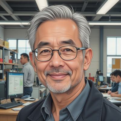 Образ и характеристики (выбран вариант: человек-инженер), Внешность, • Пол и возраст: мужчина, 50–60 лет, но с живым, ясным взглядом., • Волосы и борода: седая, аккуратная короткая борода; волосы короткие или слегка небрежные., • Очки: тонкая металлическая оправа (или без оправы) — атрибут инженера, много читающего логи., • Одежда: тёмно-синяя рабочая рубашка с закатанными рукавами или свитер крупной вязки (цвет графит, тёмно-синий). На груди — бейдж с логотипом «Эры» и надписью «Хранитель»., • Руки: иногда держит планшет или старый блокнот с ручкой — для заметок., • Общее впечатление: спокойный, уверенный, немного старомодный, но абсолютно современный в своих знаниях.,