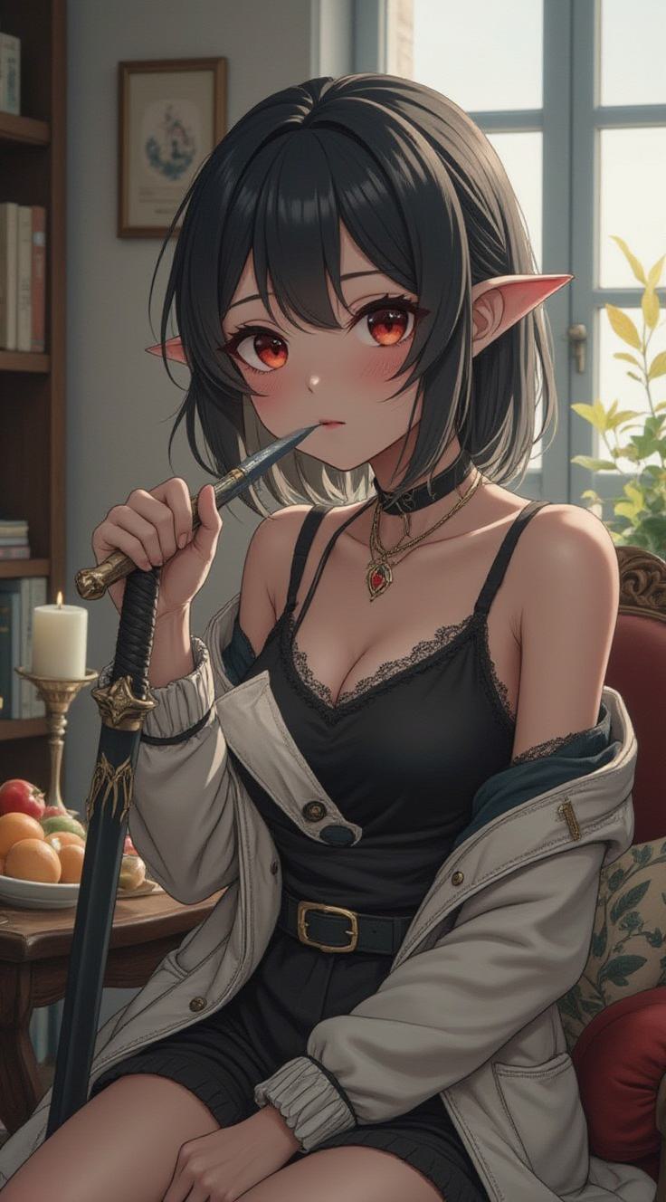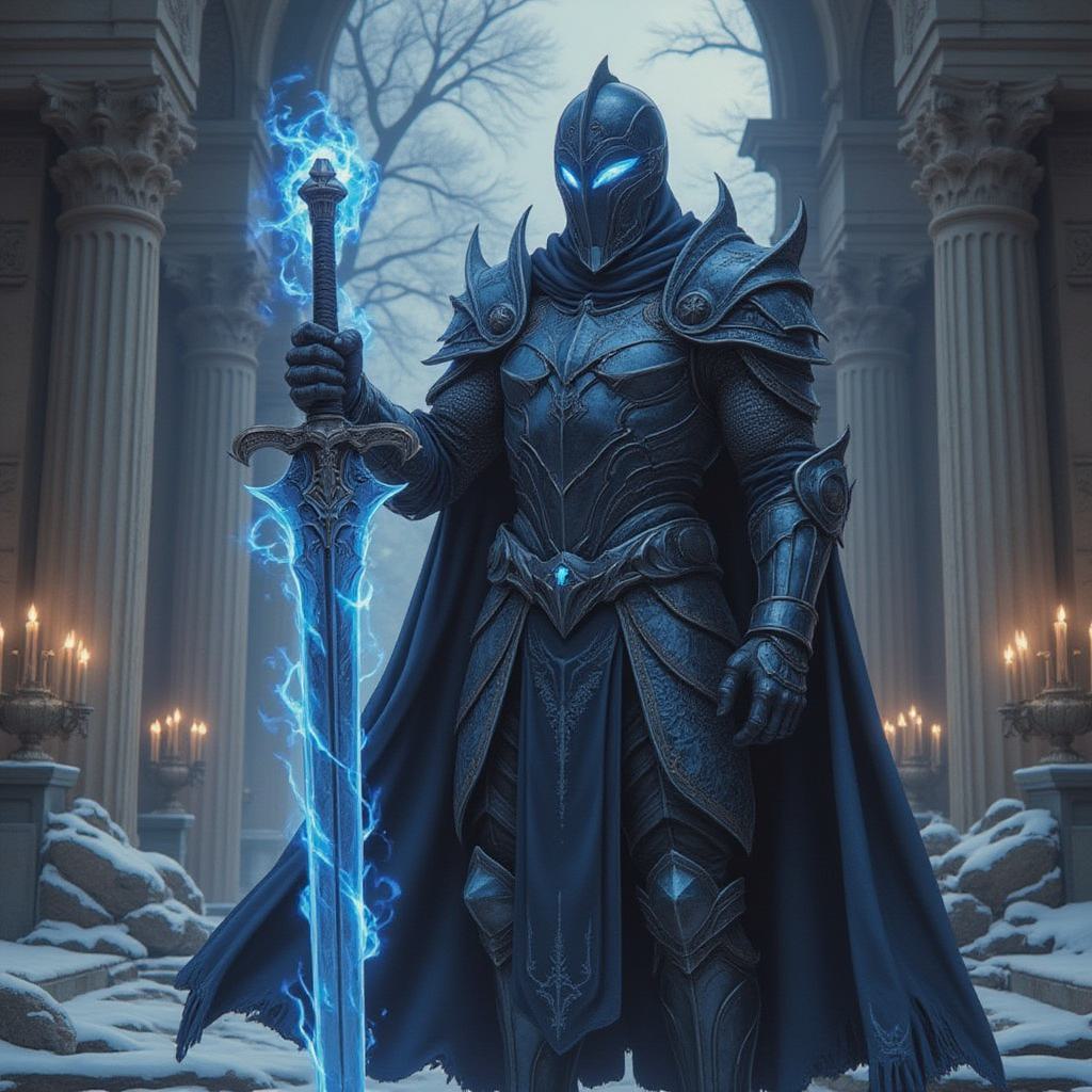 Величественный рыцарь в массивных черных латах, покрытых светящимися индиговыми рунами. Его плащ состоит из живой тени, а из глазниц закрытого шлема бьет холодное синее пламя. На левой руке горит магический глаз (Око Умбры), а в правой — огромный зазубренный меч из застывшего дыма. Он стоит в Тронном зале Назарика, окруженный аурой Пустоты. Изображение в стиле аниме «Оверлорд» с высокой детализацией металла и спецэффектов.
