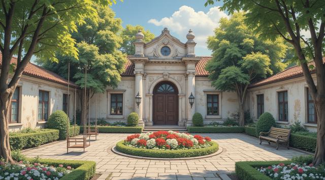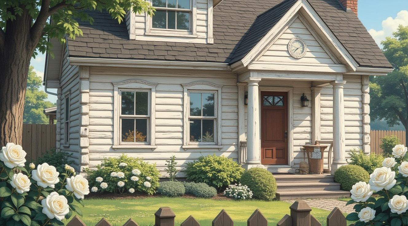 В центре композиции — бревенчатый дом с резными наличниками на окнах, как на референсе, но окрашенный в светлый, белёный цвет. Окна должны выглядеть слегка потёртыми, с винтажным, «старым» эффектом., Перед домом — аккуратный палисадник, огороженный невысоким деревянным штакетником, * пышные белые ромашки с жёлтыми сердцевинами;, * кустики тысячелистника с соцветиями;, Стиль изображения — реалистичный с лёгкой художественной стилизацией, акцент на деталях резьбы наличников и текстуре брёвен. Цветовая гамма приглушённая, с доминированием натуральных древесных тонов, пастельных оттенков зелени и нежных цветов палисадника. Высокое разрешение, чёткость деталей.