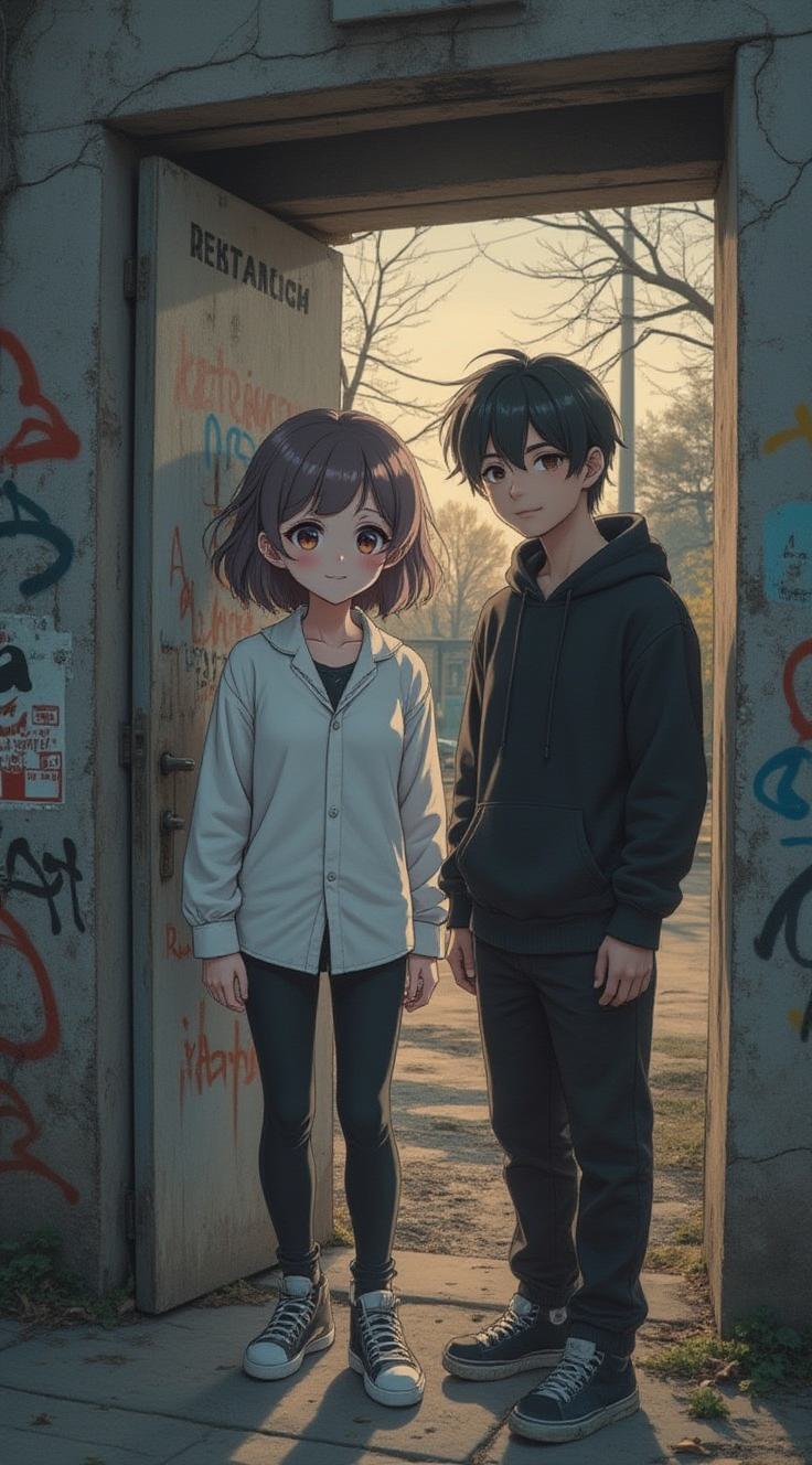 Кинематографичный кадр в стиле лоу-фай и эстетике российского думмера. Сумерки у обшарпанного подъезда хрущевки, серые бетонные стены с граффити. Парень и девушка в стиле эмо 2007 года стоят рядом. На девушке белая блузка, кудри и небрежный макияж, парень в оверсайз худи и пыльных кедах-конверах. Они пьют ярко-розовый напиток Блейзер из пластиковой бутылки и курят Бонд с синей кнопкой. Атмосфера меланхолии, зернистость старой кинопленки, тусклый свет уличного фонаря. Детализированная текстура старой металлической двери. Вдохновлено клипами Lil Peep, глубокие тени, сырые эмоции, высокая детализация, 4k.