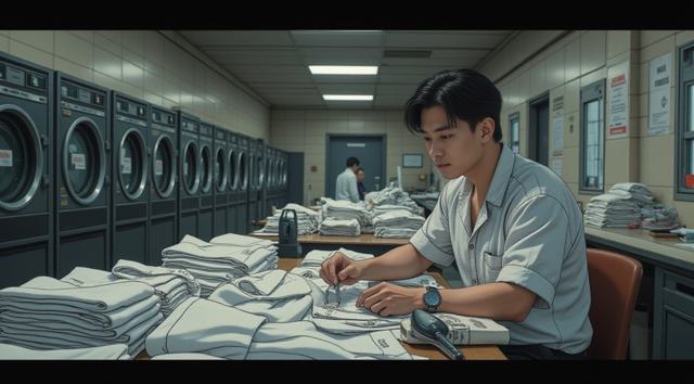 moody prison laundry scene, a man worker sitting at a table sorting neatly folded prison uniforms, holding a sharpened toothbrush or hidden note discovered inside the clothes, looking uncertain, calm repetitive workspace with piles of fabric, labels, iron and baskets, industrial washing machines and metal interior in the background, dim cold lighting with soft shadows, subtle tension breaking a peaceful routine, cinematic composition, grounded realistic style with slight stylization, detailed environment, atmospheric game promo illustration