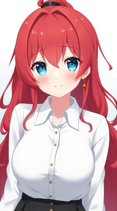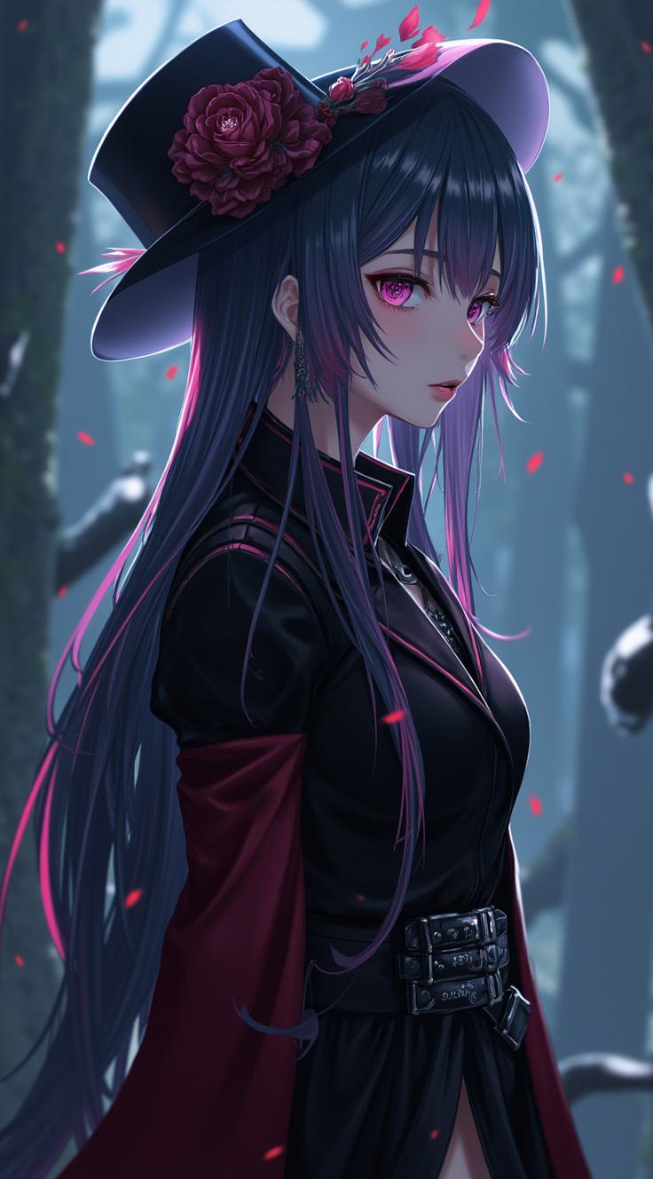 1 девушка с длинными, волнистыми рыжими волосами, обрамляющими ее лицо. У нее большие голубые глаза с длинными ресницами и светлая кожа. На ее ушах видны золотые серьги в форме капель., Девушка одета в белую рубашку с длинными рукавами, застегнутую на несколько пуговиц. На рубашке надеты черные подтяжки. Сверху на ней надето черное пальто или плащ, который она держит рукой за край., На ней также надеты черные брюки с ремнем. Задний фон представляет собой зимний пейзаж, с заснеженными деревьями и землей. Общее впечатление от изображения создает ощущение элегантности и стиля.