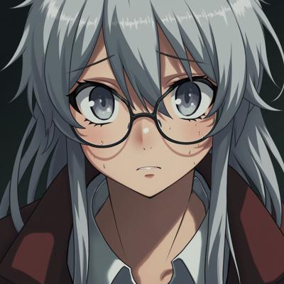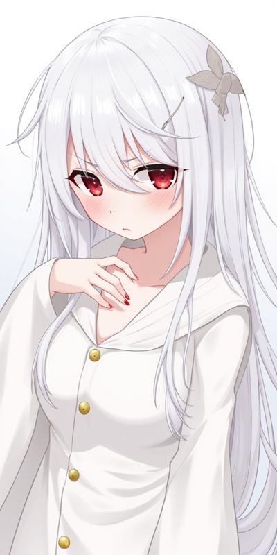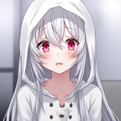 An anime-style girl with long, flowing white hair and tired, weary red eyes. Her face is partially covered with bandages that cross over the bridge of her nose and diagonally across her cheek, leaving her mouth and nose uncovered. She wears a white dress with a hood and buttons, simple yet elegant, giving her a ghostly aura. Her pale skin shows crimson and burgundy stains, scattered like haunting marks. She stands silently, gazing thoughtfully into the distance, her expression calm but filled with fatigue and melancholy. The atmosphere should be mysterious and slightly eerie, with soft lighting and a delicate balance between beauty and sorrow.