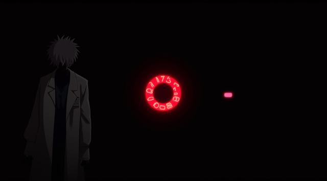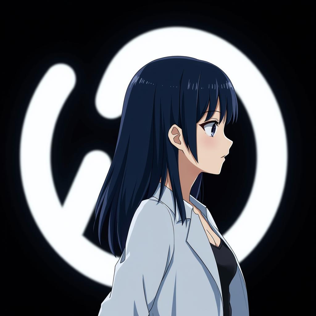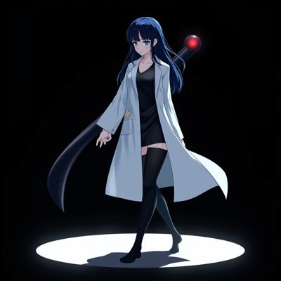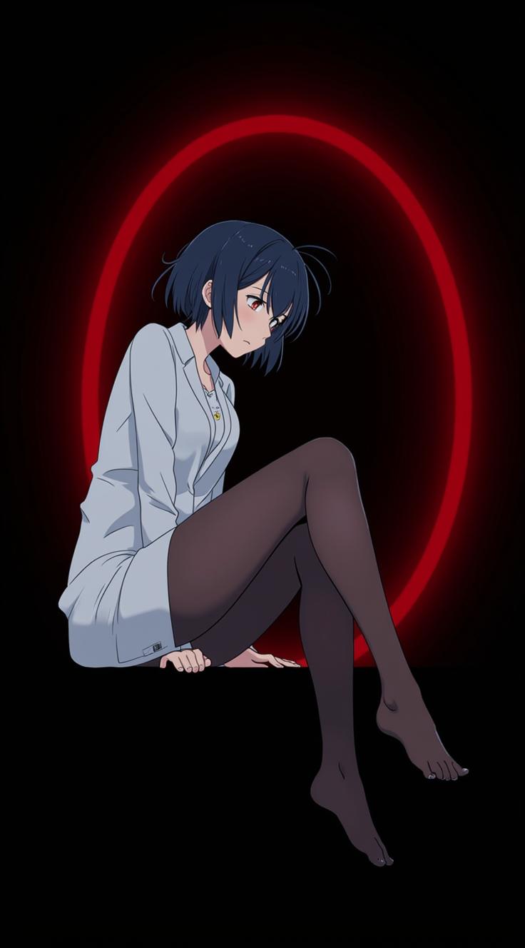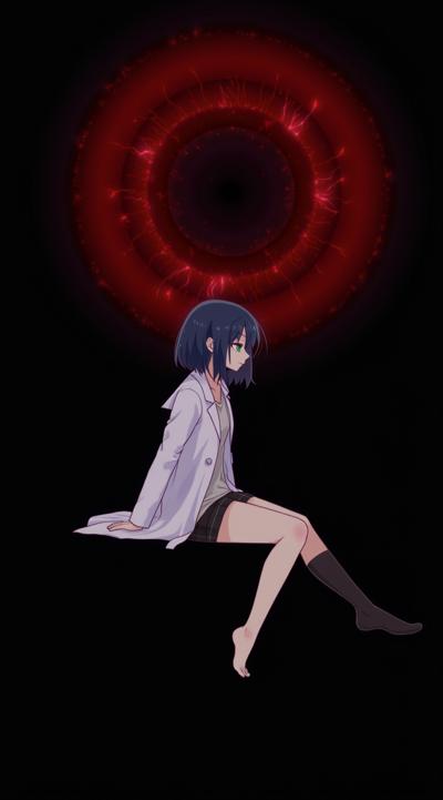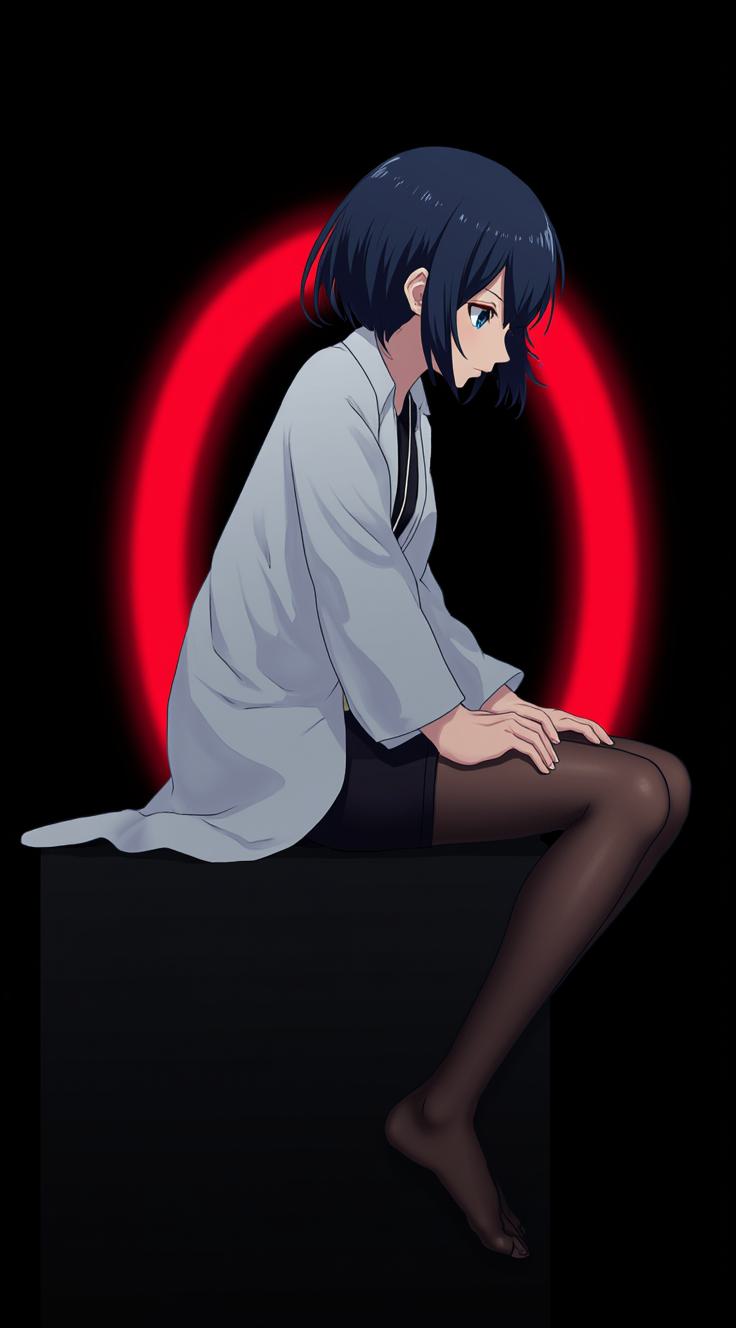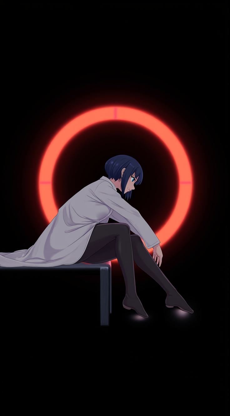девушка сидит боком в белом лабораторном халате на черном. У нее короткие темные-синие волосы и она смотрит вниз. Девушка без обуви, на ней надеты темные чулки. Одна нога прямая, другая согнута приподнятым коленом. На черном фоне за ней расположена красная светящиеся цифра 0. Цифра 0 не так сильно отражается на поверхности. ее лицо более красивое и сидит она спиной справа