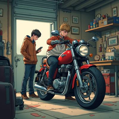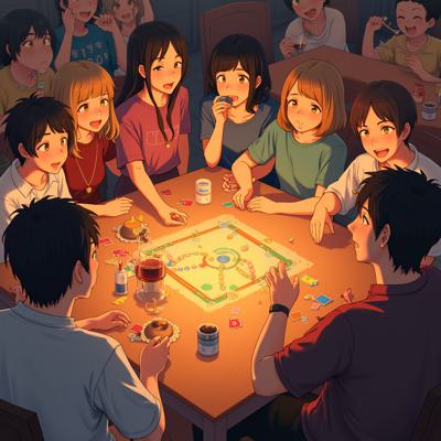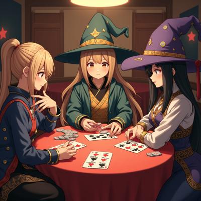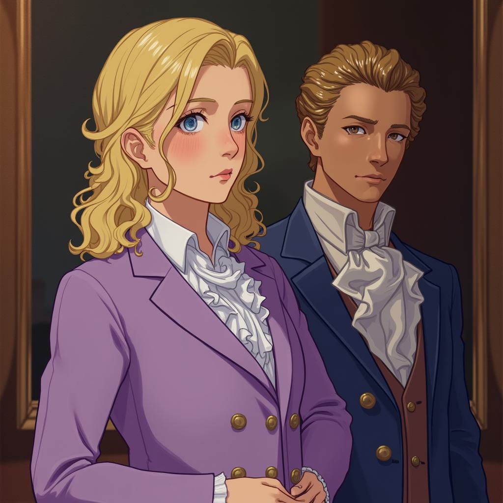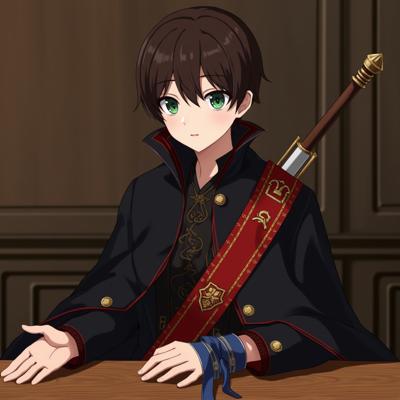 Аниме парень с темно каштановым волосами и зелёными глазами в чёрной рубашке с узором и черном длинном пальто было богато украшено с красной окантовкой правая ладонь у него перемотана синей шёлковой лентой на поясе красный кушак со славянским узором, На поясе у него сабля сидит он за большим дубовым столом в избушке напротив него сидит аниме девушка с черными волосами и фиолетовыми глазами в славянском платье они о чём то мило беседуют смеются
