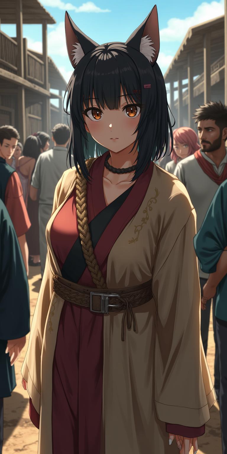 Рабыня красивая взрослая женщина, около 25-27 лет, с кошачьими ушками, с гетерохромией, темные густые волосы длиной до плеч., Одета в изношенную робу, роба подпоясана верёвкой, на шее кожаный ошейник. , Она стоит на шумном рабском рынке с деревянными клетками и прилавками, окружена толпой людей и торговцев. Фоном служат старинные здания и пыльные улочки в средневековом стиле. Вечерний свет создаёт контраст между светом и тенью, передавая драматизм сцены. , Стиль — аниме, с прорисовкой лиц и текстур, передающий эмоции и атмосферу, изображение в полный рост.