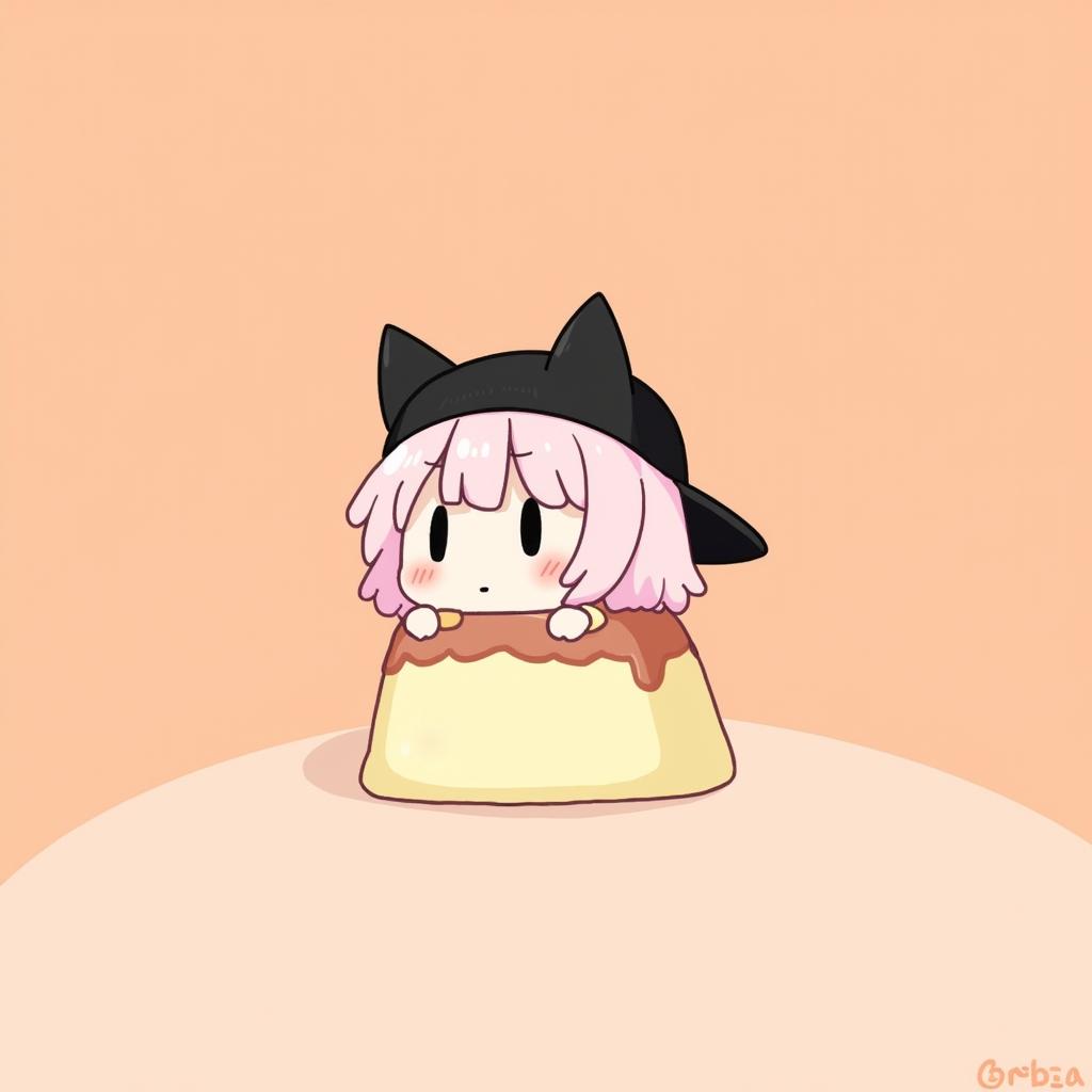 Простые укршаения фона, уютная рисовка в пастельных теплфх оранжевых цветах. Персонаж в чиби стиле. На голове черная кепка с черными кошачьими ушками. Полностью светло-розовые волосы как зефир, без примесей других цветов . Невинное удивление на лице. Светлая кожа. Сидит на огромном пудинге. Белая кофта оверсайз. Ярко-фиолетовые глаза. Бабочки вокруг летают мелкие