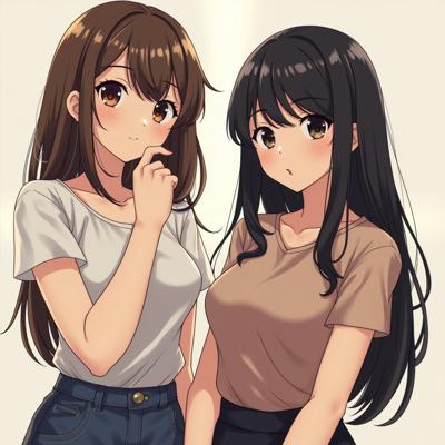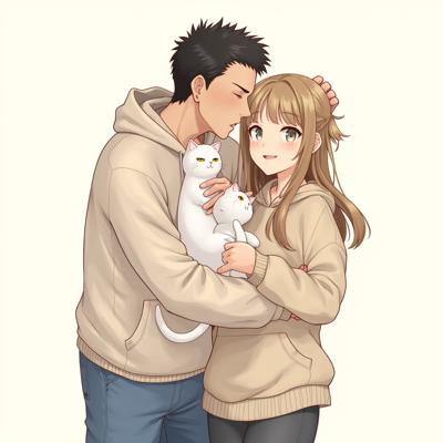 Темноволосый парень с серыми глазами в бежевом худи и синих джинсах , стоит счастливый и обнимает девушку со светлыми длинными русыми волосами и серо- карими глазами , в бежевом худи и серых джинсах , девушка в объятьях мило улыбается и держит двух котов , одного белого с золотистыми глазами и второго белого с голубыми глазами , парень и девушка стоят в полный рост , смотрятся мило и улыбаются , Стиль : Аниме