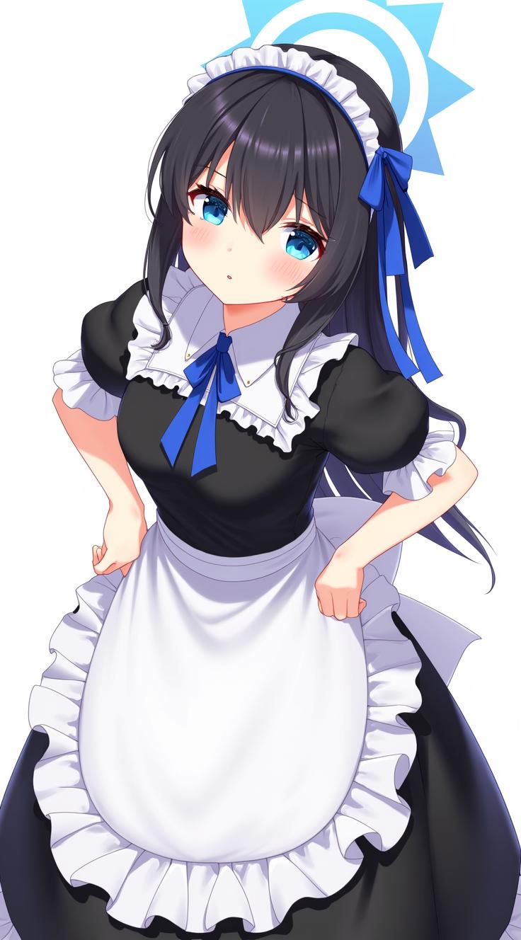1girl, alternate costume, apron, bags under eyes, black dress, black hair, blue eyes, blue hairband, blue ribbon, blush, breasts, cowboy shot, crossed bangs, dress, enmaided, frilled apron, frilled dress, frills, hair between eyes, hairband, halo, hands on own hips, head tilt, jewelry, leaning forward, long hair, looking at viewer, low twintails, maid, maid apron, neck ribbon, one eye closed, open mouth, puffy short sleeves, puffy sleeves, ribbon, short sleeves, simple background, solo, thighhighs, twintails, very long hair, white apron, white background, white thighhighs, wrist cuffs, zettai ryouiki