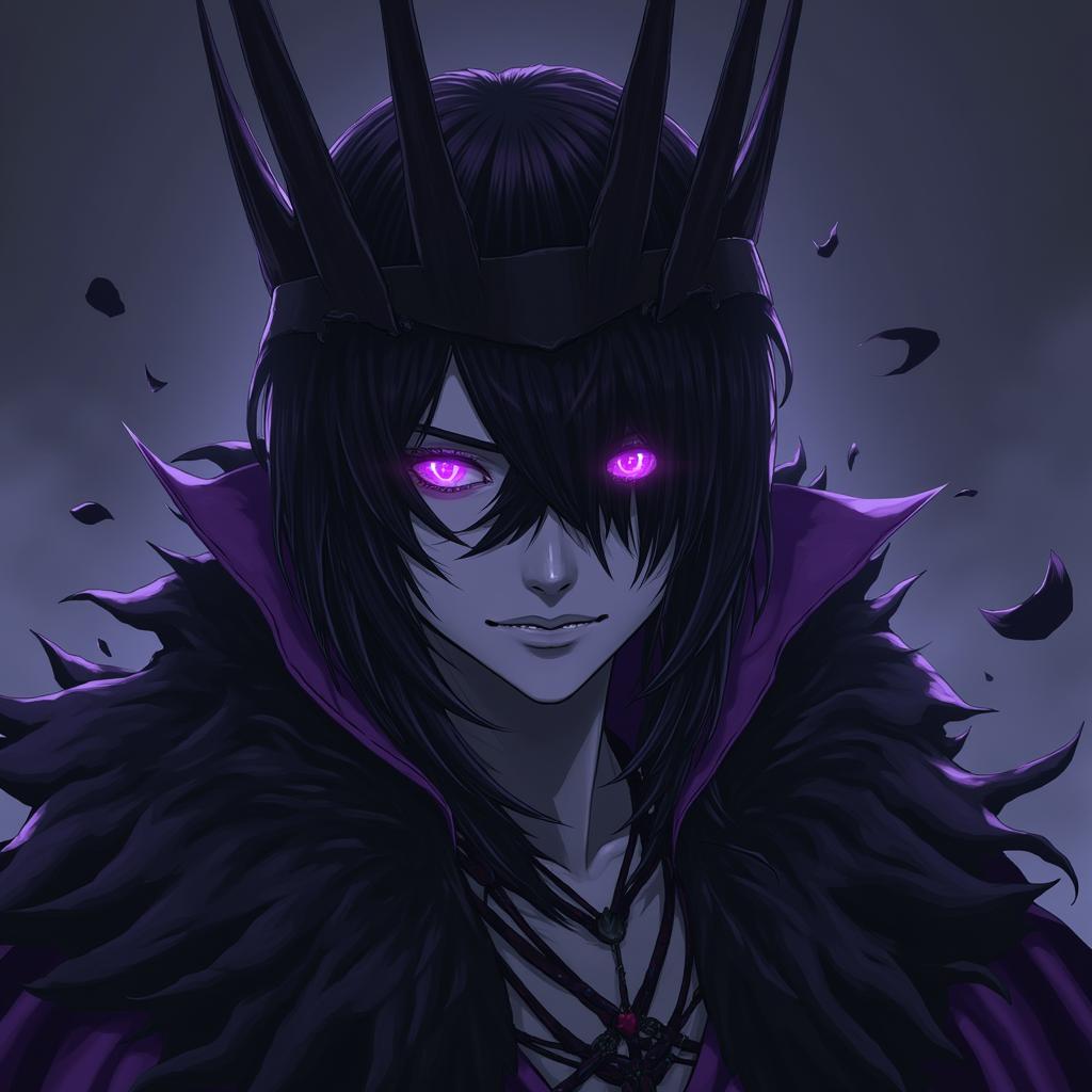 Anime-style dark fantasy portrait of Dark Kingmey3er, Lord of Darkness and Undeath. Undead king with pale gray cracked skin, glowing dark magic veins. Eyes glowing violet with eerie intensity. Jagged black obsidian crown with sharp spikes partially covering face. Dark tattered cloak with necromantic symbols, armor with glowing purple crystals. Bones and runes visible through cracks. Magical energy swirls around hands and head, ghostly mist around shoulders. Dramatic lighting, dynamic composition, moody and epic anime aesthetic, detailed, dark fantasy anime character.