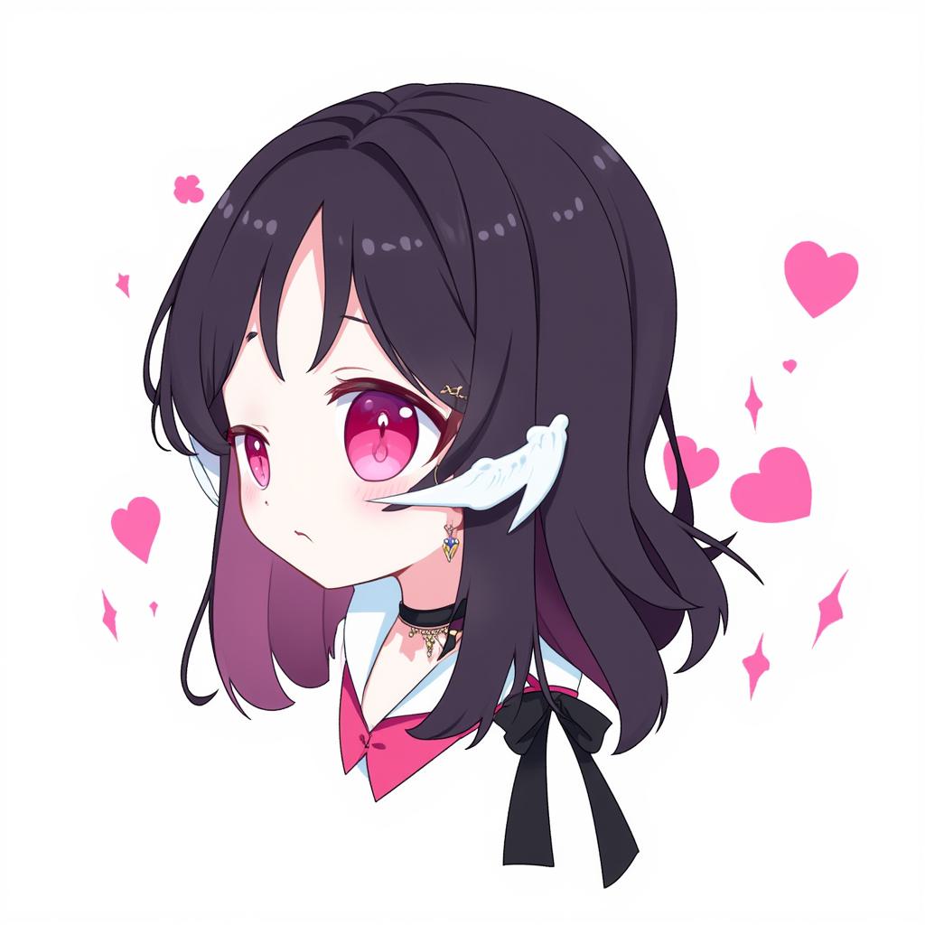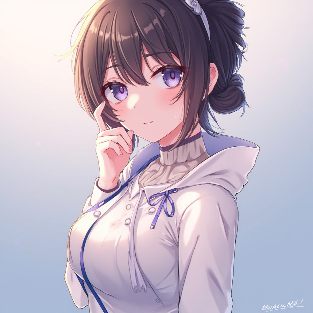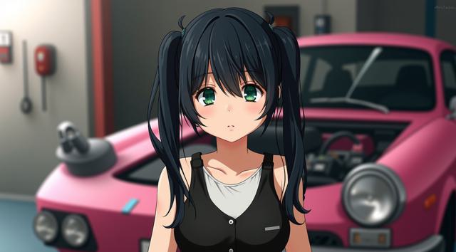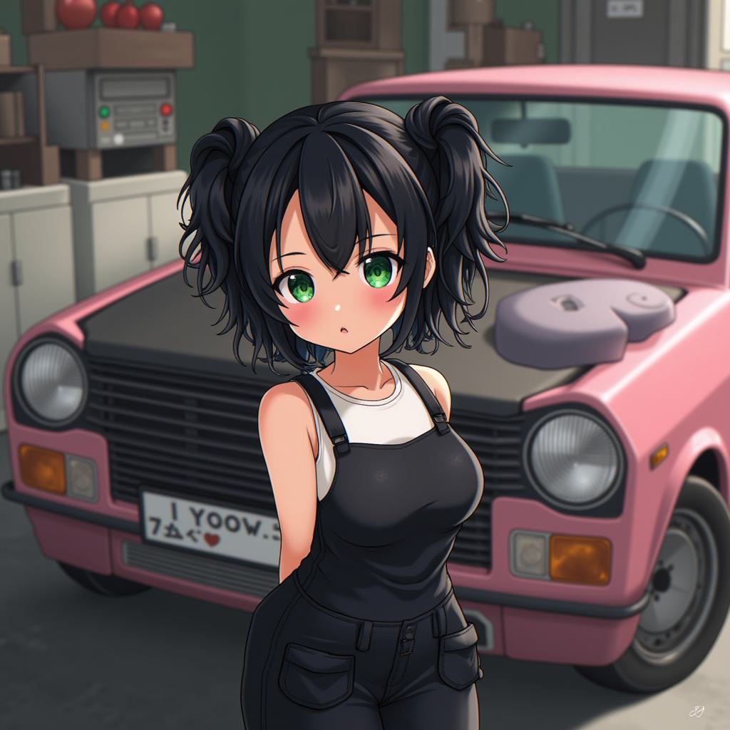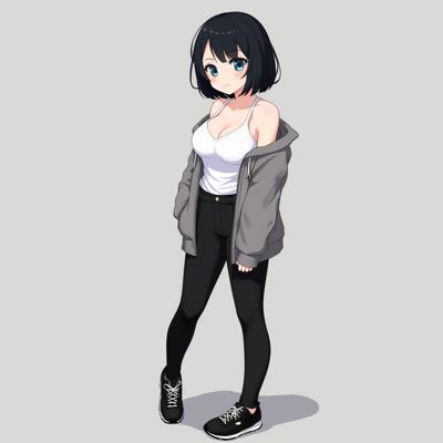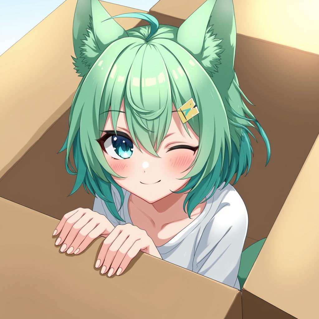 Девушка с лисьими ушами, с пышными волосами цвета зеленой мяты и бирюзовыми прядями, с короткими волосами до плеч которые непослушно торчат, сидит в большой картонной коробке. Её большие, голубые глаза с зрачками в виде восклицательного знака с хитрым прищуром, с ухмылкой на губах. Она полулежит в коробке, облокотившись локтем на её край и подперев голову рукой. На ней синий спортивный костюм, рукава которого немного сползли с плеч, обнажая ключицы. Короткие шорты едва прикрывают бедра. Хвост, в тон волосам, лениво свешивается из коробки. Поза расслаблена и непринужденна. Вокруг - хаотичное нагромождение других картонных коробок.