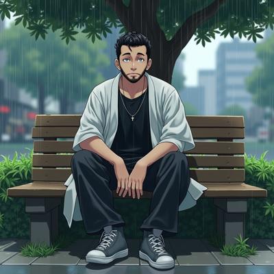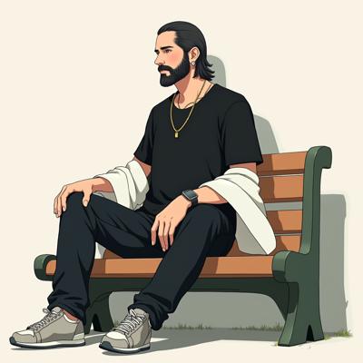 Мужчина средних лет с бородой, причёска полубокс не короткий волос, лицо в профиль для камеры, не азиатской внешности, на правой руке цепочка, на левой квадратные смарт часы, одет в черную майку, хаори белого цвета, джинсы "бананы" чёрные, кроссовки серого цвета с белой подошвой, сидит на лавочке среди городских массивов под деревом