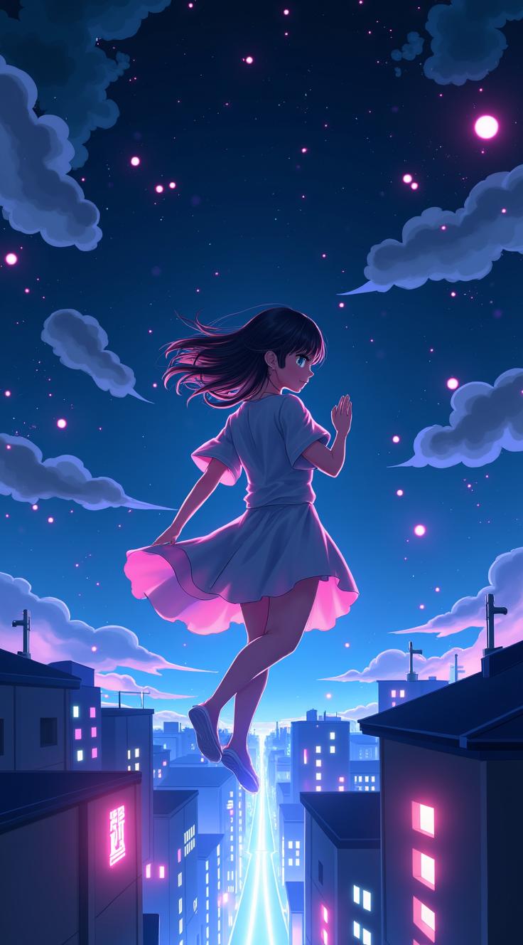 «Магическая, мечтательная атмосфера ночного города, освещённого мягким неоновым светом. Девушка с лёгкими развевающимися волосами летит или парит над крышами, словно свободная птица, в окружении светящихся частиц и звезд. Вокруг — плавные линии и абстрактные формы, передающие ритм и энергию трека «Лети за мной». Цветовая палитра — холодные синие, фиолетовые и розовые оттенки, создающие ощущение загадочности и романтики. Визуальный стиль — сюрреализм, с акцентом на движение и свободу.»